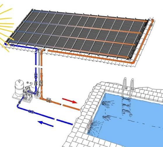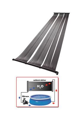 Systém solárních kolektorů se pomocí hadic propojí k filtrační pumpě (odtok vody) a bazénu (přítok vody). Průtokem v solárních panelech se voda zahřeje a vrací se zpět ohřátá do bazénu. Design solárních panelů byl navržen tak, aby mohlo docházet k ohřevu vody pomocí co největší plochy. Ohřev vody tímto způsobem je velmi efektivní a samotný ohřev vody je bez nákladů. Solární panel je vyroben z TPE (termoplastický elestomer) a PE (polyethylen) materiálu, nepodléhá korozi a ničení v důsledku působení rzi. Solární panely jsou oboustranné, což zvyšuje jejich životnost.