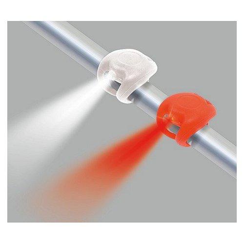 Sada 2 ks, bíle světlo dopředu a červené dozadu. Napájení knoflíkovou baterií (jako dárek jsou baterie přiloženy). Každé světlo je osazeno vysocesvítivou LED diodou s velmi nízkou spotřebou proudu.