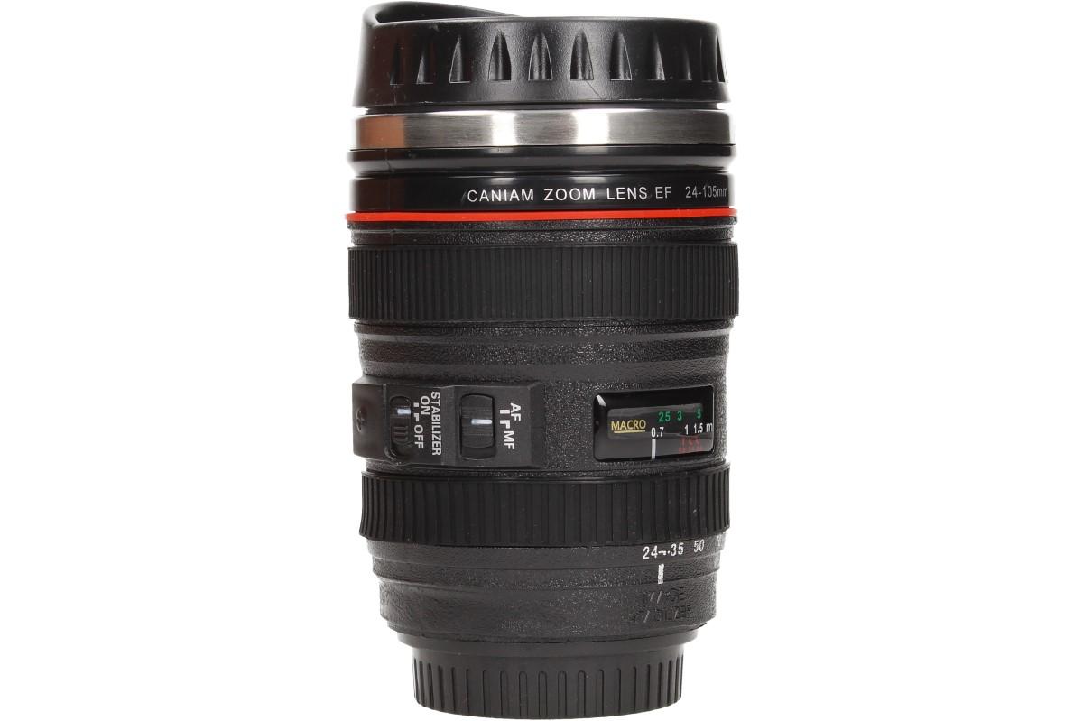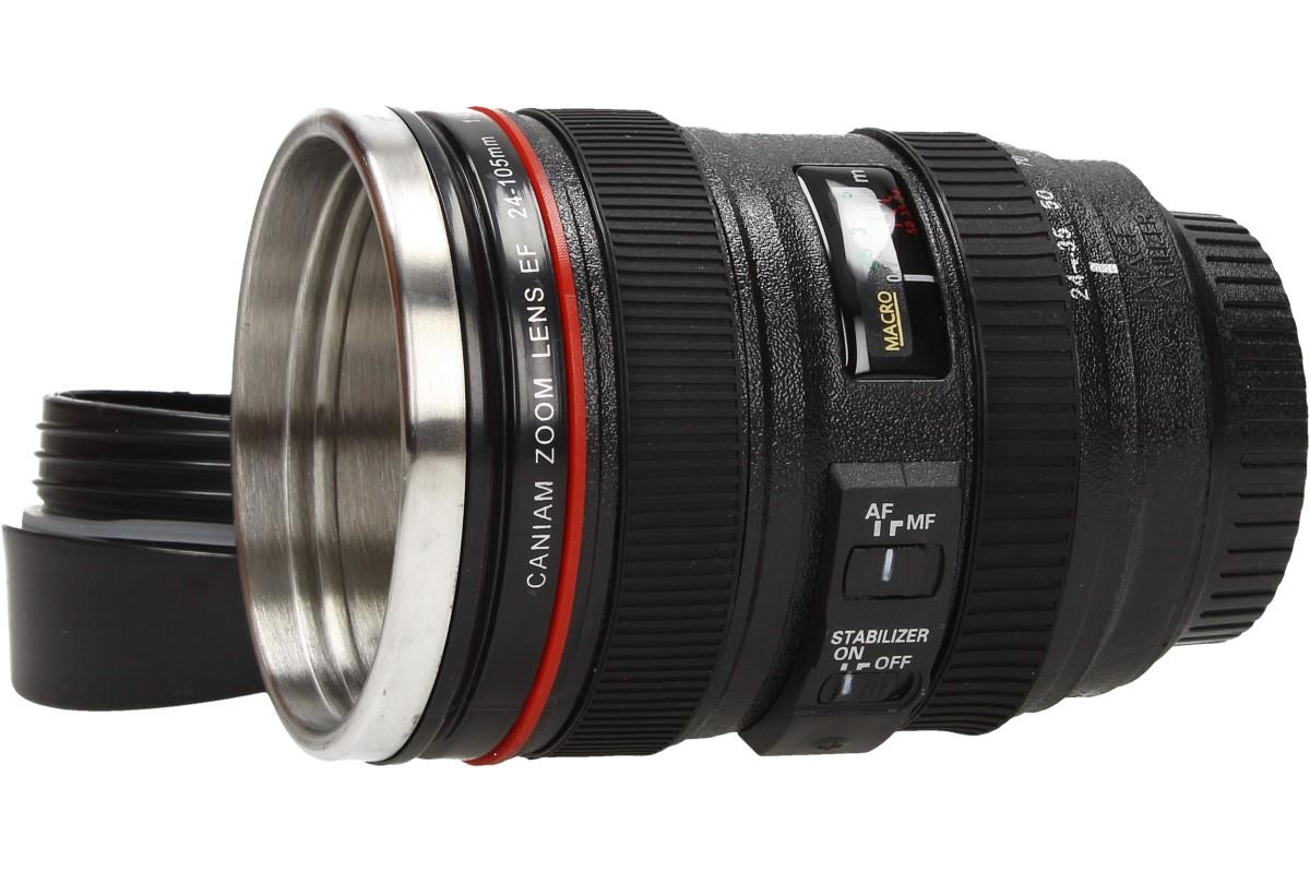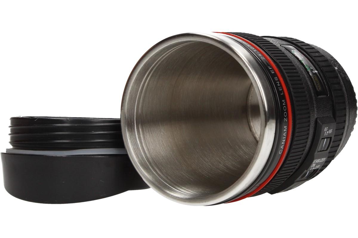 Termohrnek s originálním designem je věrnou kopií objektivu EFS 28-135mm a je skvělým dárkem nejen pro fotografy. Díky nerezové vložce a krytce se závitem a těsněním krásně udrží teplotu vašeho oblíbeného nápoje, ať teplého či studeného. Můžete si ho vzít kamkoli sebou, ať už na cestu do práce nebo na procházku do přírody. Pogumovaný povrch ostření a clony objektivu zaručí, že vám hrnek nevyklouzne z ruky. Krytka objektivu může posloužit jako podšálek, nebo talířek na sušenky ke kafíčku apod. Termohrnek je snadno omyvatelný.
