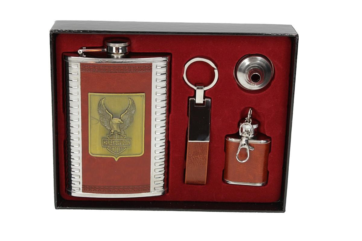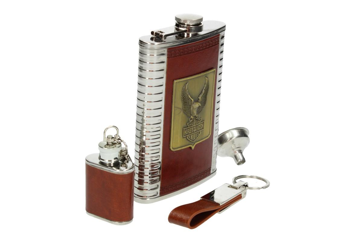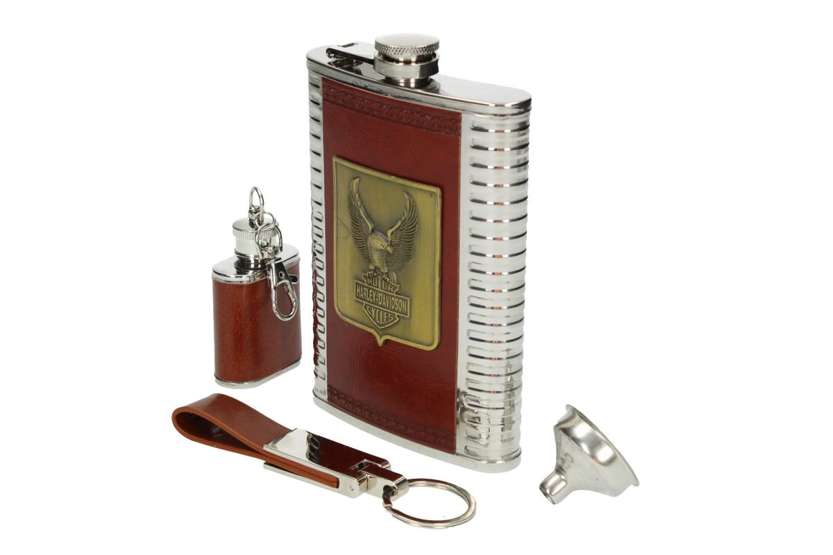 - Sada pro milovníky jedné stopy, obsauhje vetší nerezovou Stainless steel 9 Oz placatici se znakem a nápisem Motor Harley Davidson Cycles + ještě jednu maličkou placatku 1 Oz a k tomu nalévací trychtýřek a ještě přívěskový závěs.