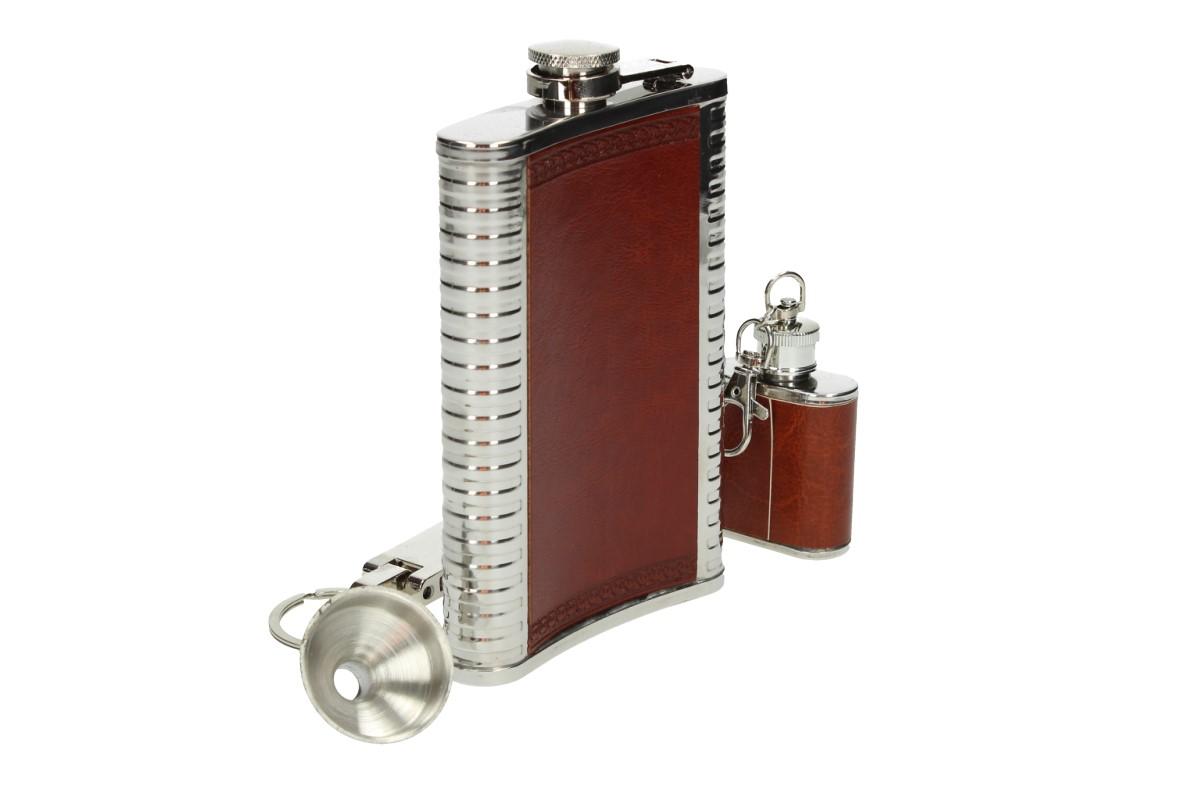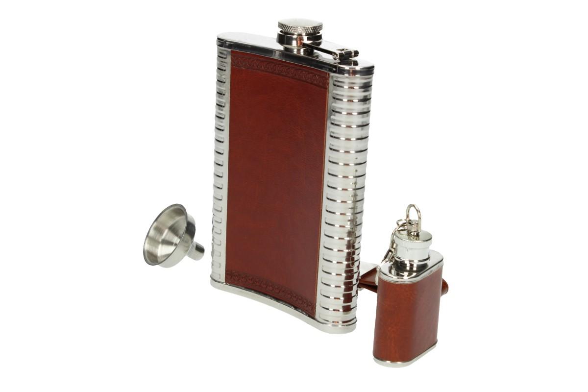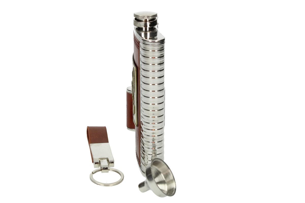 Nerezová placatka o objemu 850 ml s panáky a zavíracím nožem 5v1 v robusním kože…
