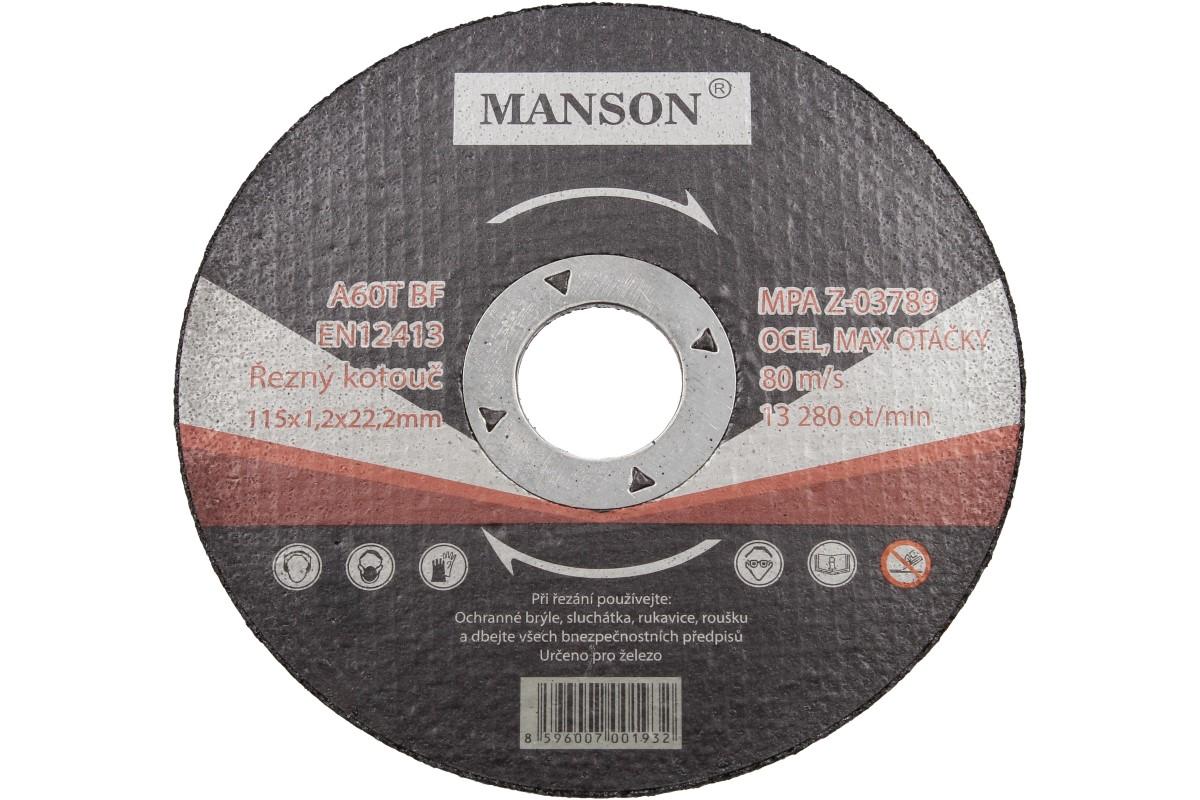 Řezný kotouč Manson určený pro železo, je ideální řezný kotouč, který málo ubývá a kvalitně řeže. Je určen pro standardní flexy s rozměry 120 mm, průměr středu 22 mm.