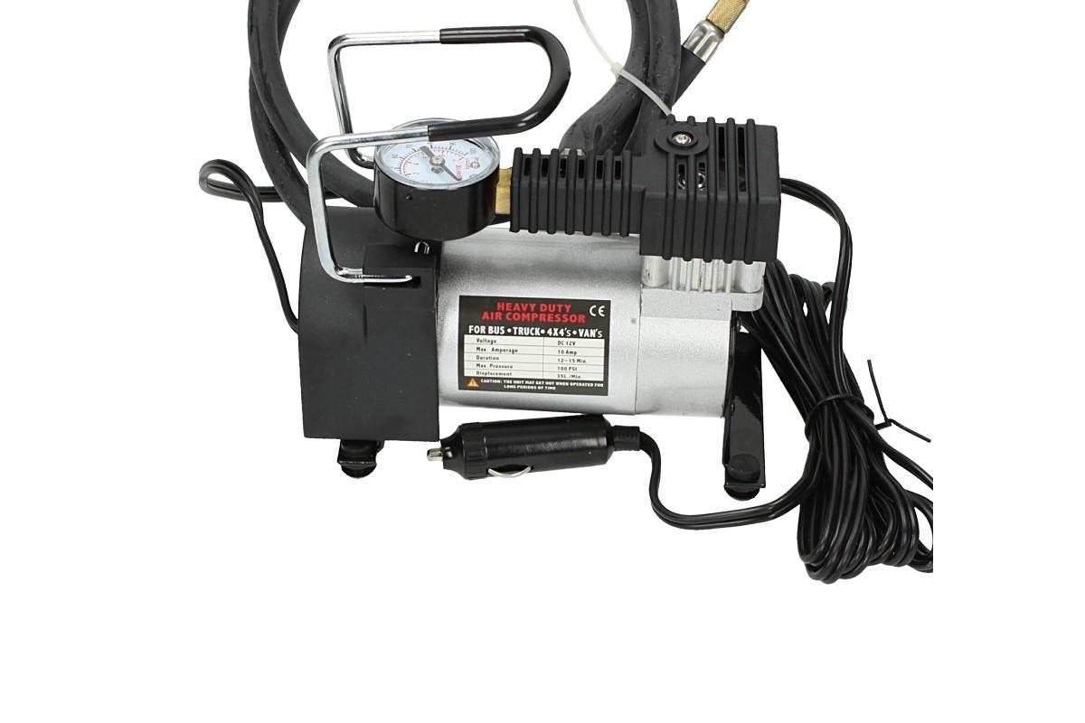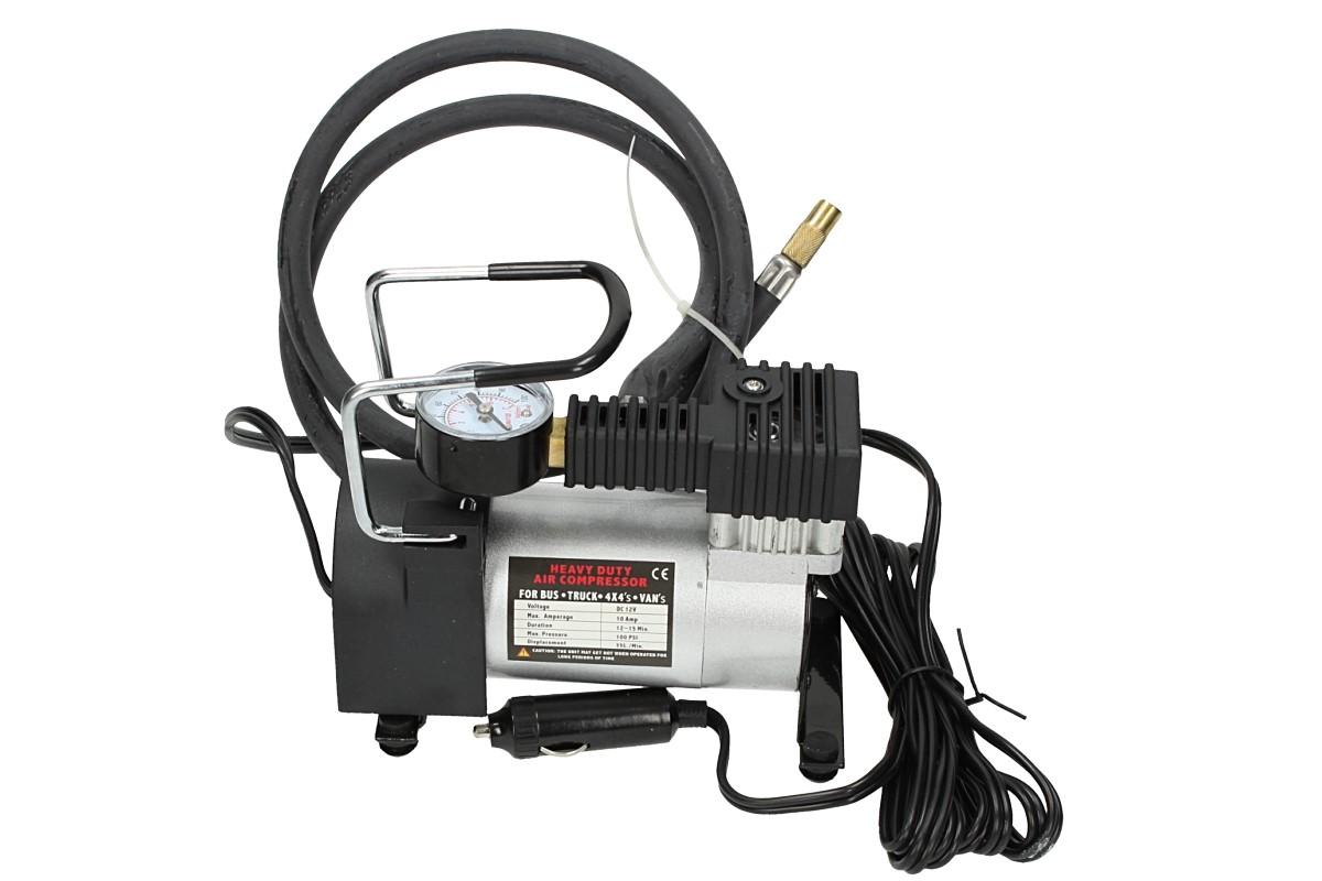 Celokovový kompresor na 12V, je malý a lehce přenosný, přesto podává výkon 35 litrů za minutu. S vestavěným měřákem tlaku, metrovou vzduchovou hadicí a tří metrovým kabelem na 12 V do zdířky autozapalovače se stane nepostradatelným vybavením vaší garáže, nebo nedílnou součástí vašeho vozu. Snadno tak nafouknete nejen pneumatiky, ale i všechny ostatní kola, nebo větší nafukovací bazén a výřivku.