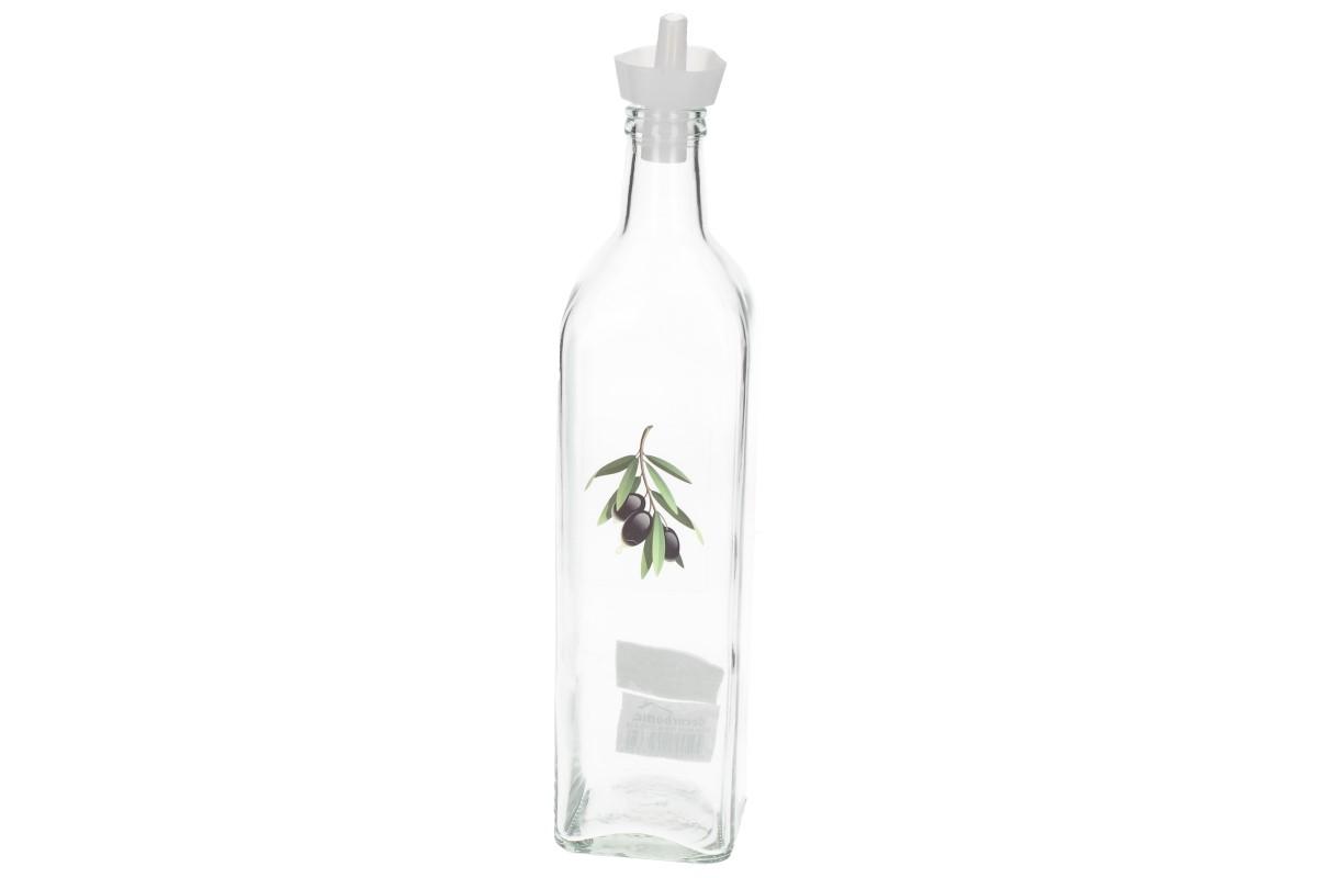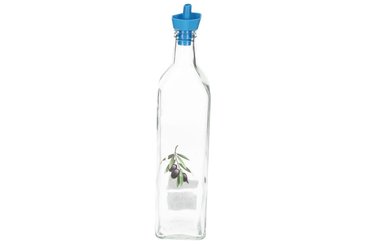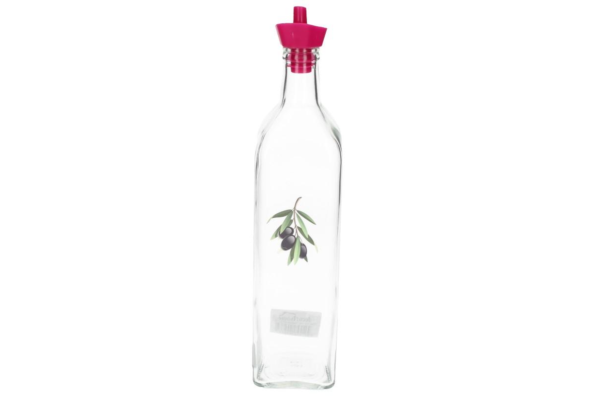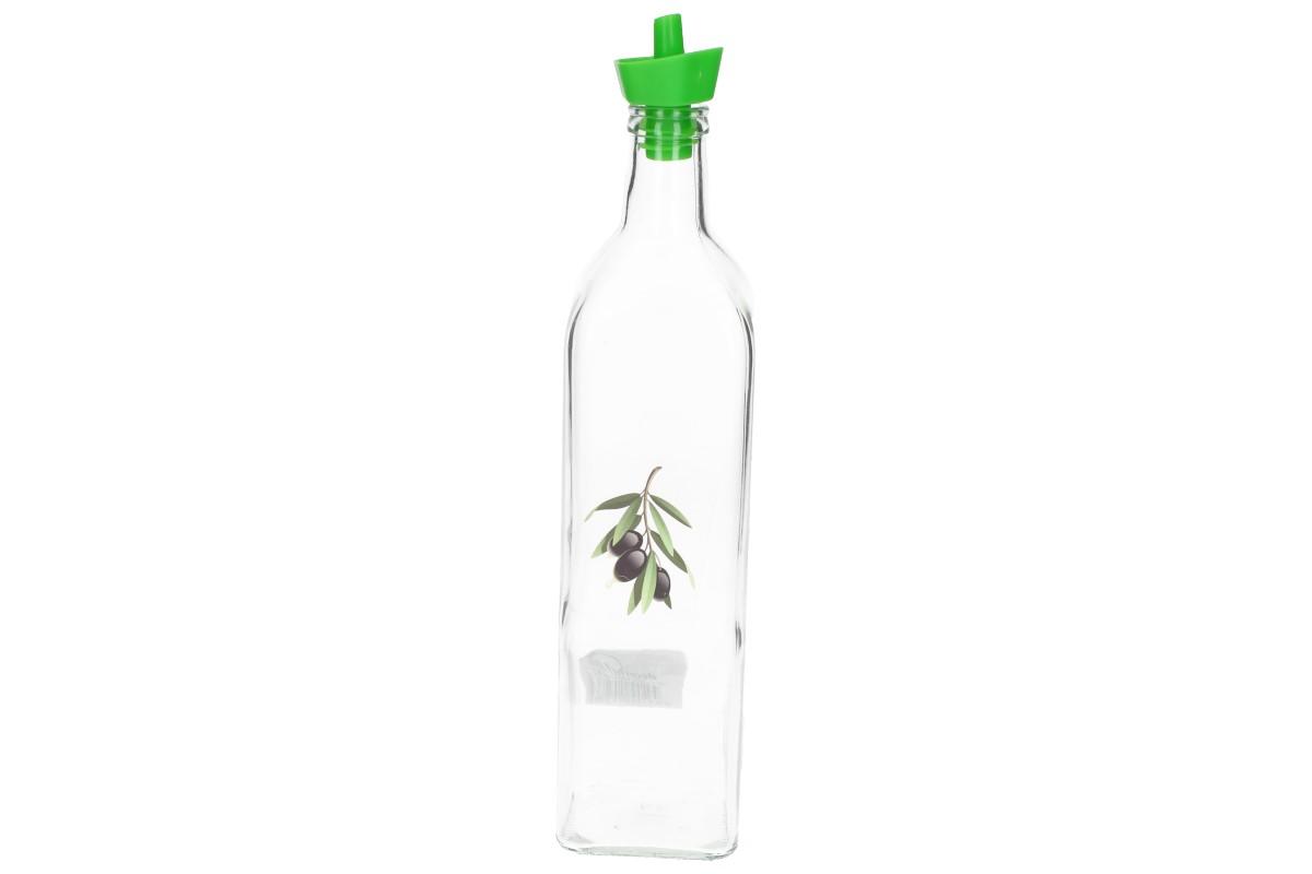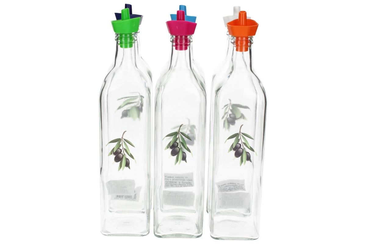 Skleněná láhev s plastovým dávkovačem na olej, ocet nebo jiná tekutá ochucovadla určené do kuchyně s motivem olivy o objedmu 0,75L
