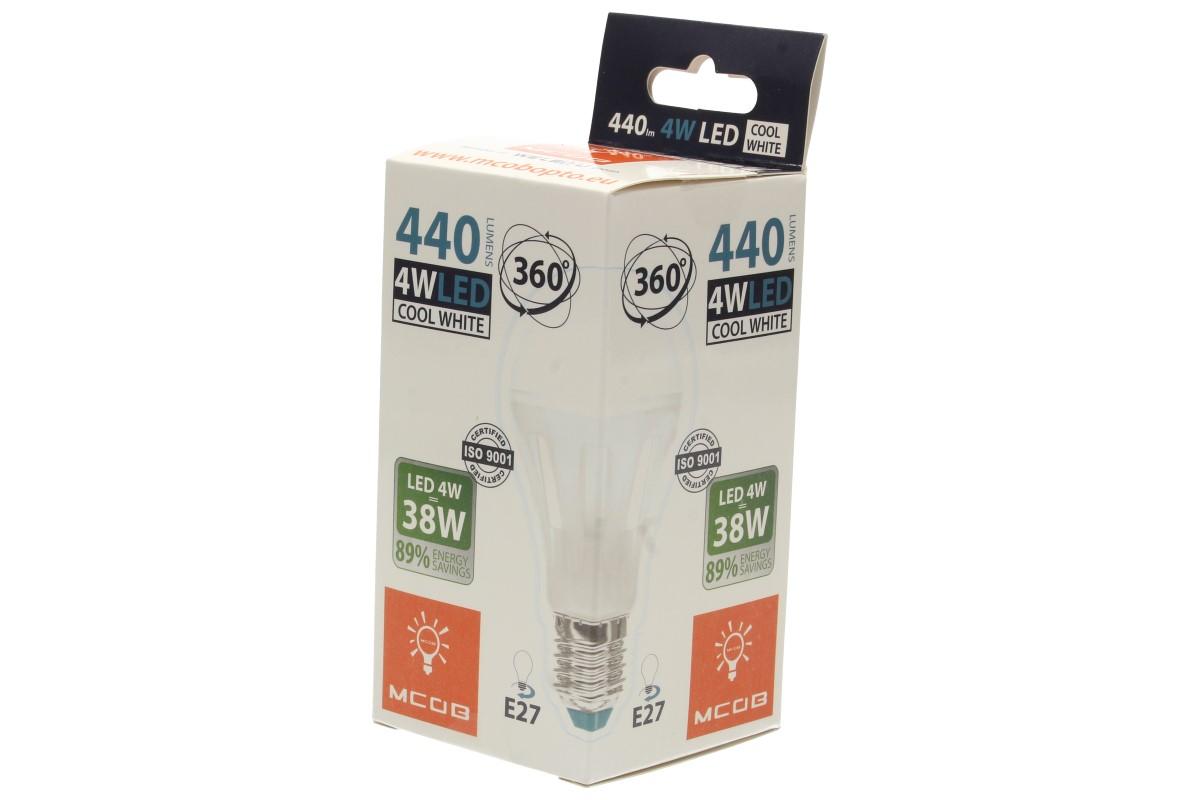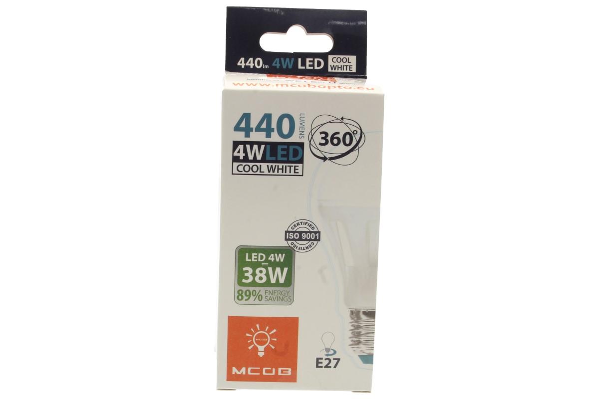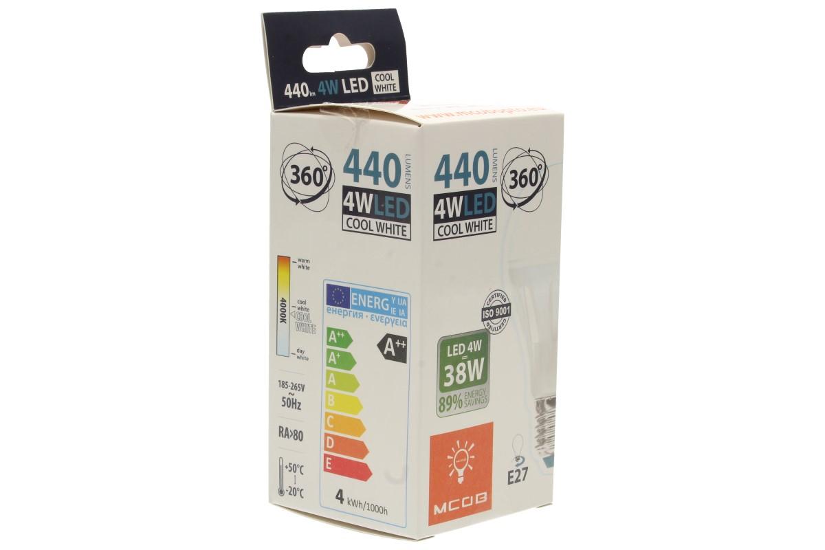 Led žárovka MCOB 4W E27 4000K - studená bílá patří mezi nejkvalitnější žárovky na českém trhu, jejichž životnost je garantována na bezmála 40 000h svitu a počtu sepnutí vypínačem až 50 000 krát. Žárovky značky MCOB jsou Certifikované, splňující ty nejpřísnější normy, jejich čipy jsou připájené na hliníkové desce a to z důvodu lepšího chlazení. Žárovky značky MCOB disponují nulovým startovacím časem. V praxi to znamená, že nečekáte na nažhavění žárovky, ale svítí okamžitě po zapnutí vypínače. Žárovky MCOB mají jako jedny z mála vyzařovací světelný úhel 360 stupňů a jsou snadno recyklvatelné.