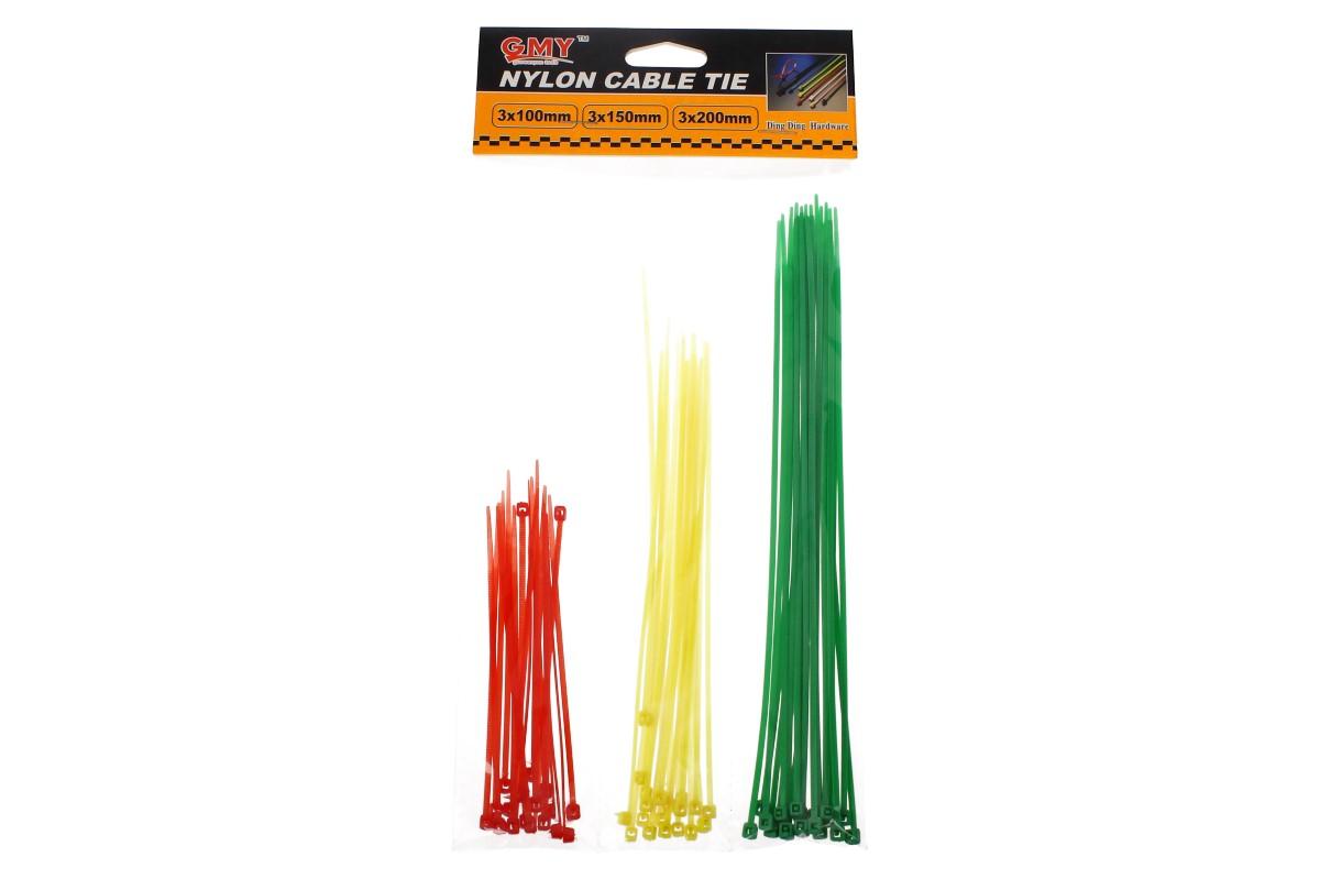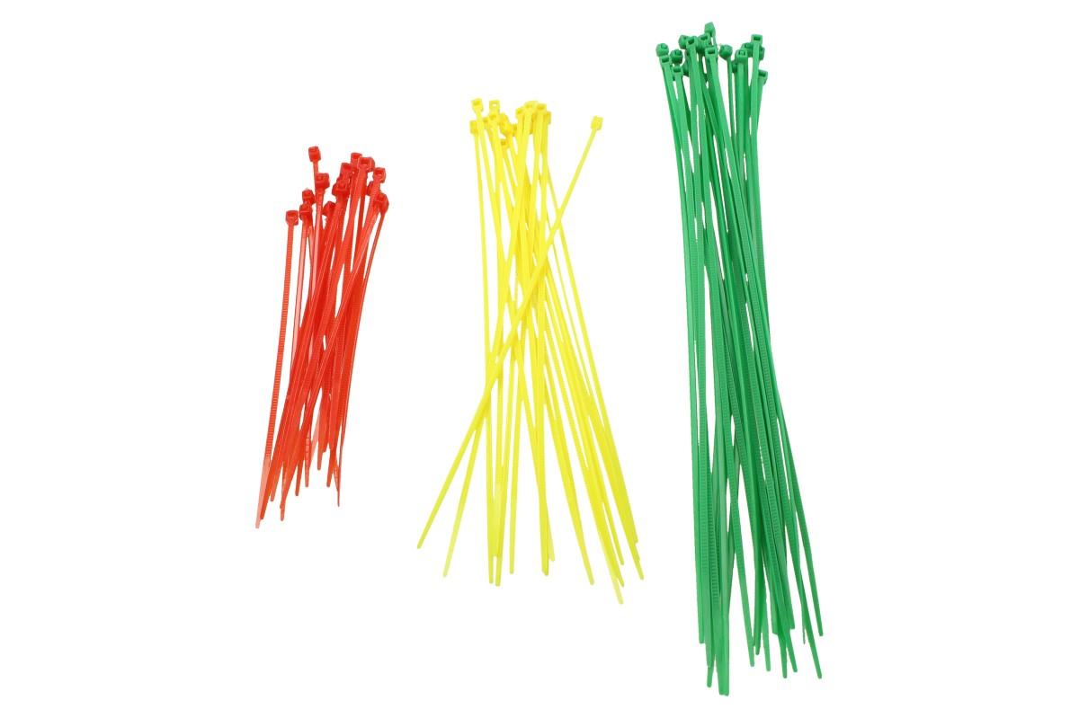 Pásky stahovací, nylonové, 20 ks x 200 mm, 20ks x 150 mm, 20 ks x 100 mm, teplota při montáži je min. -10° C, provozní teplota -40° C až 85° C, pevnost v tahu 8 kg, 60 ks, barevné (zelená, červená, černá).
