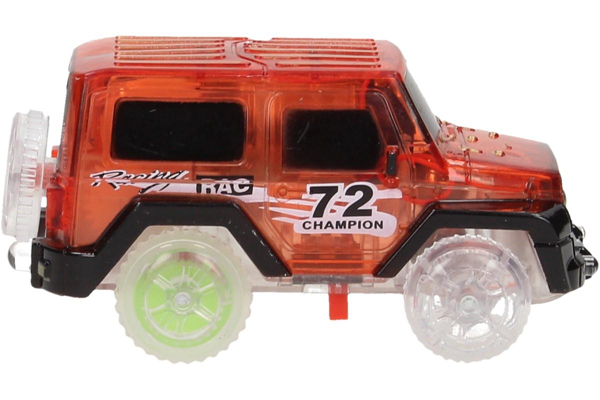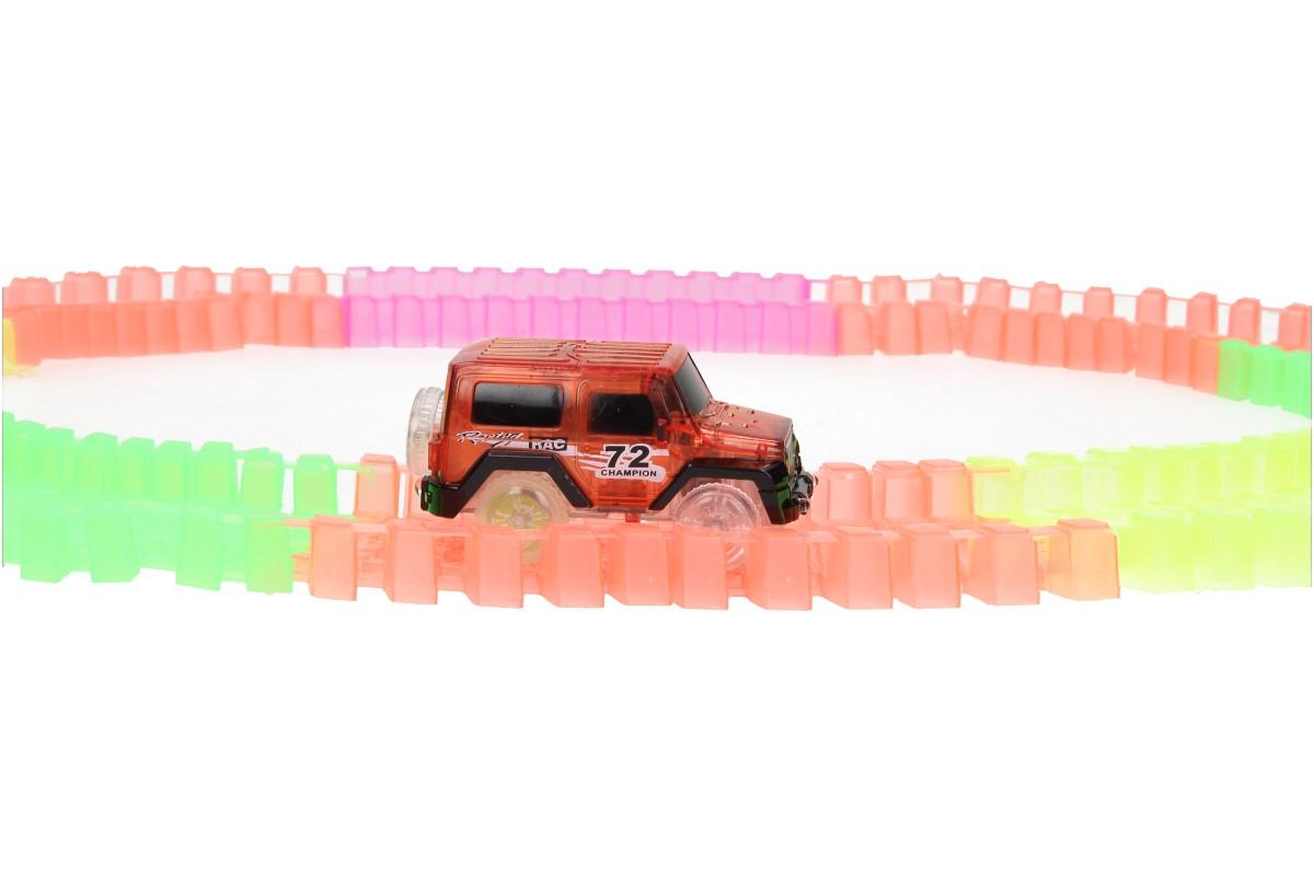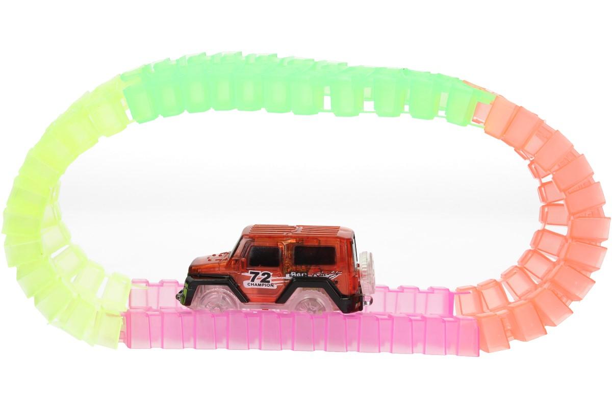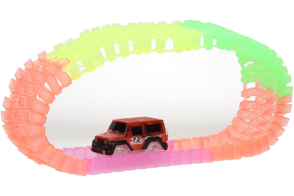 Autodráha se skládá z 220 reflexních dílků ve veselých barvách (zelená, růžová, žlutá a oranžová). Tato jedinečná závodní dráha s délkou 3,3 m je vyrobena z flexibilních dílů, které se dají jednoduše pospojovat do jakékoliv barevné kombinace a umožňují měnit design dráhy do jakéhokoliv tvaru nebo vzoru. Kdykoliv můžete dokoupit další sadu a tak autodráhu zvětšit a prodloužit. Základní sada obsahuje červené autíčko poháněné baterií. Autíčko má 5 LED světel, které teprve ve tmě vytvoří kouzelnou show. Díky průsvitnému materiálu vytvoří LED žárovky uvnitř skutečně krásnou hru světel. Autíčko svítí a jede po nádherně barevné autodráze. Nekonečné možnosti sestavování, zaručují hodiny zábavy. Sestavte autodráhu do kruhu do kola, se zatáčkou, podložte ji a vytvoříte kopec a jen sledujte jak si s tím autíčko poradí.