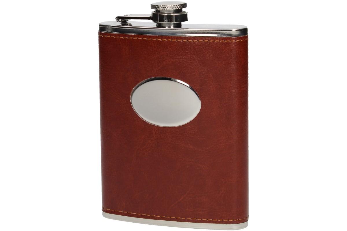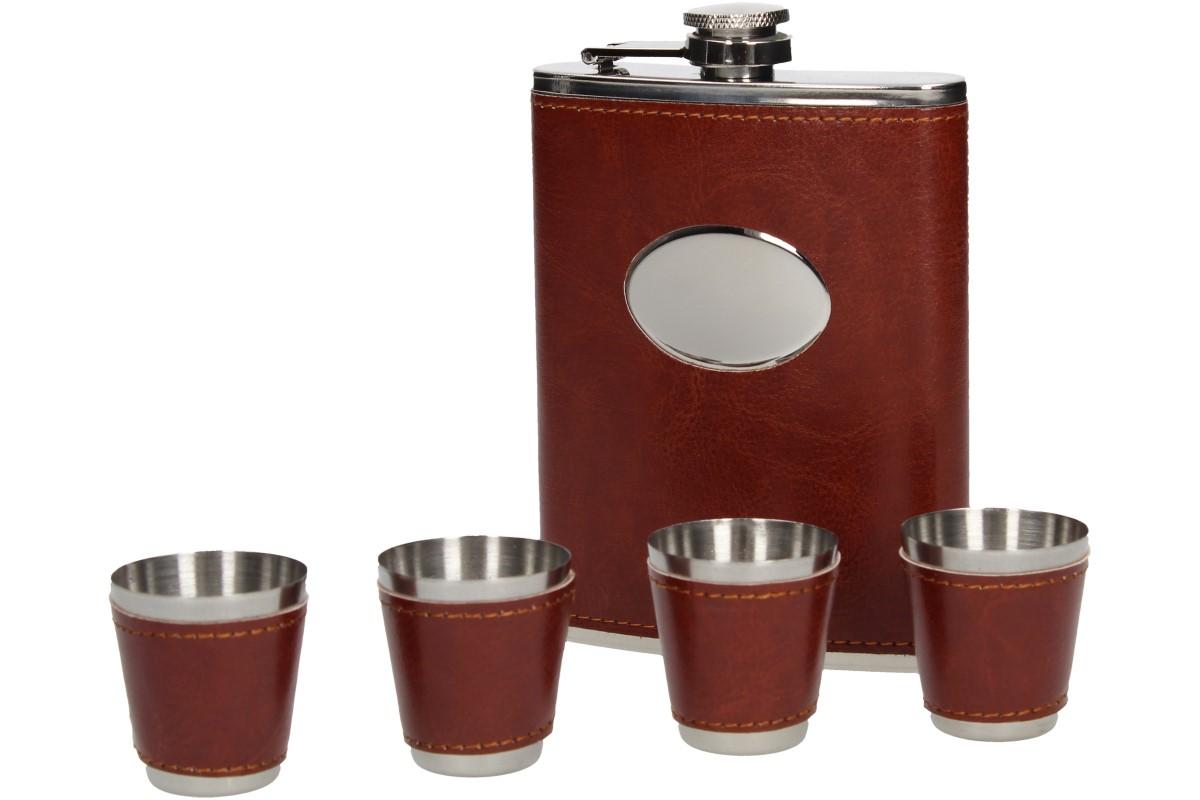 Nerezová placatka o objemu 850 ml s panáky a zavíracím nožem 5v1 v robusním kože…