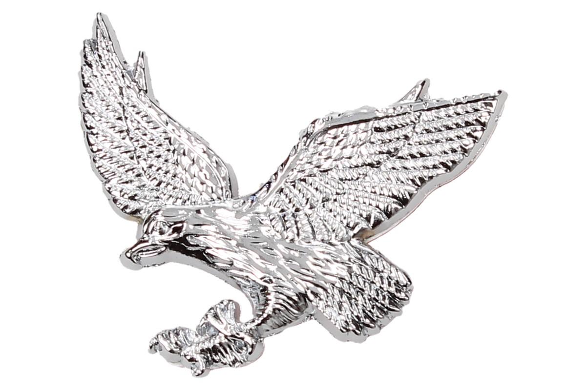 Orel je vyrobený z kovu a má chromovanou povrchovou úpravu. Rozpětí je 8 cm, výška 6 cmn a tloušťka 0,5 cm