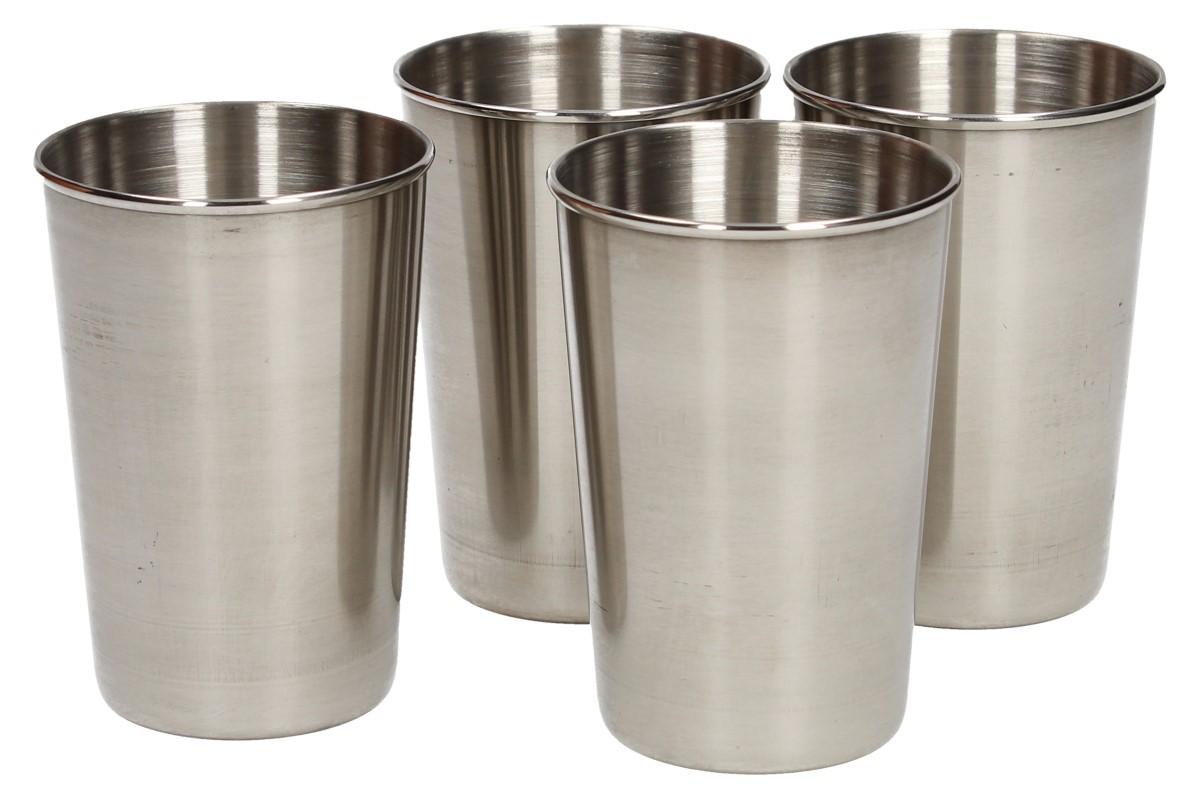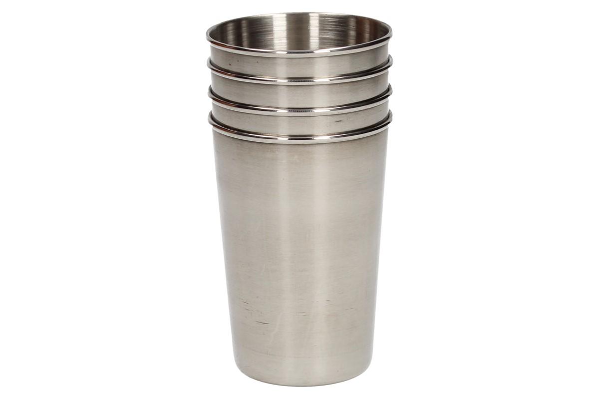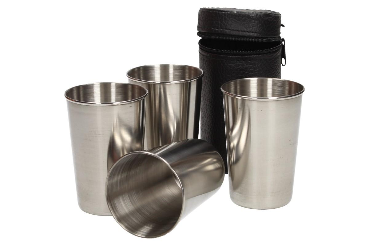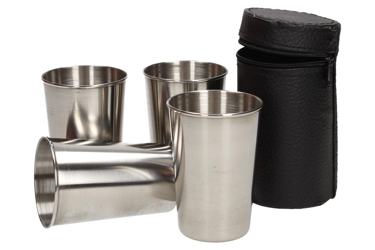Velké kovové nerezové panáky na alkohol 8x6 cm v sadě 4 kusy s pouzdrem jsou díky skladovatelnosti vhodné na čundry nebo výlety.