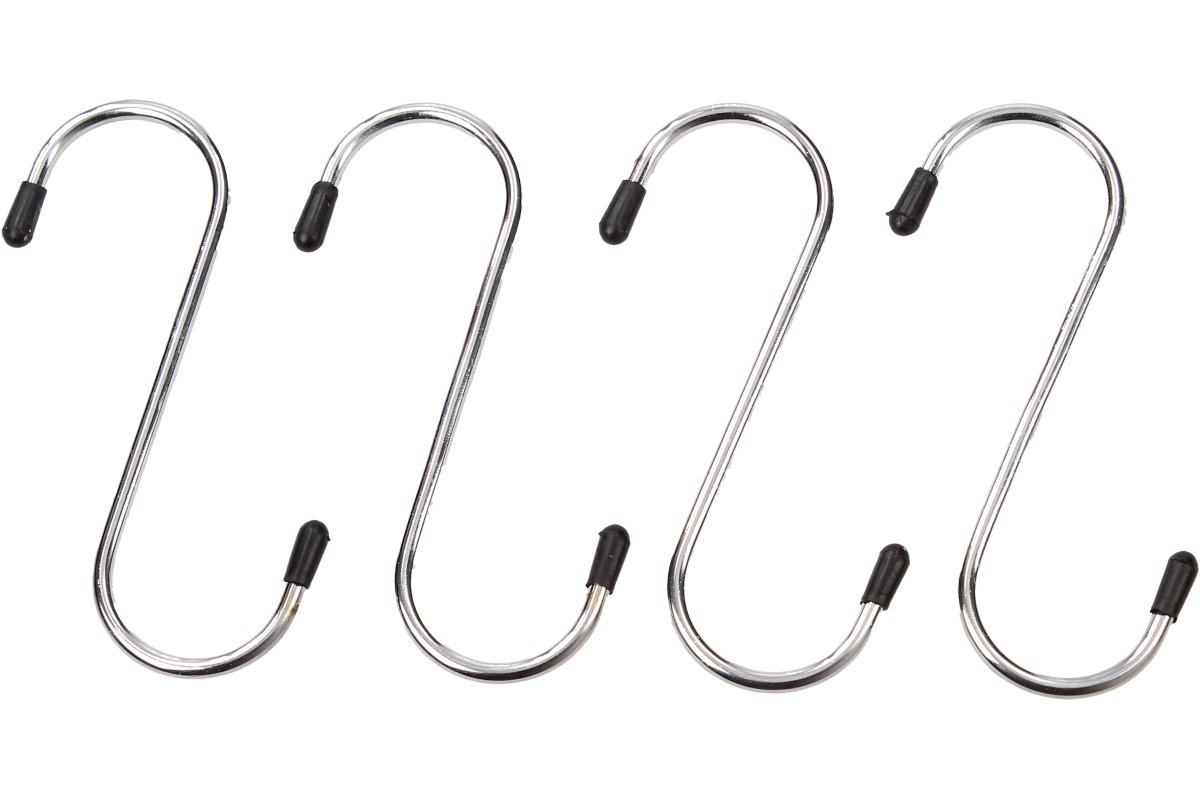 Háček "S" k madlu/závěsné tyči chrom 4ks 9 cm je praktický chromový háček s bezpečnostním plastovým špuntem na obou koncích, využijete v kuchyni pro zavěšení utěrek i jiných drobných kuchyňských náčiní a pomůcek. Ve spíži se budou zase hodit pro zavěšení salámu, nebo síťového pytlíku s citrusy. V koupelně dobře poslouží na zavěšení ručníků, nebo mycích hub ve sprše. Háčky jsou ideální i do garáže i do dílny