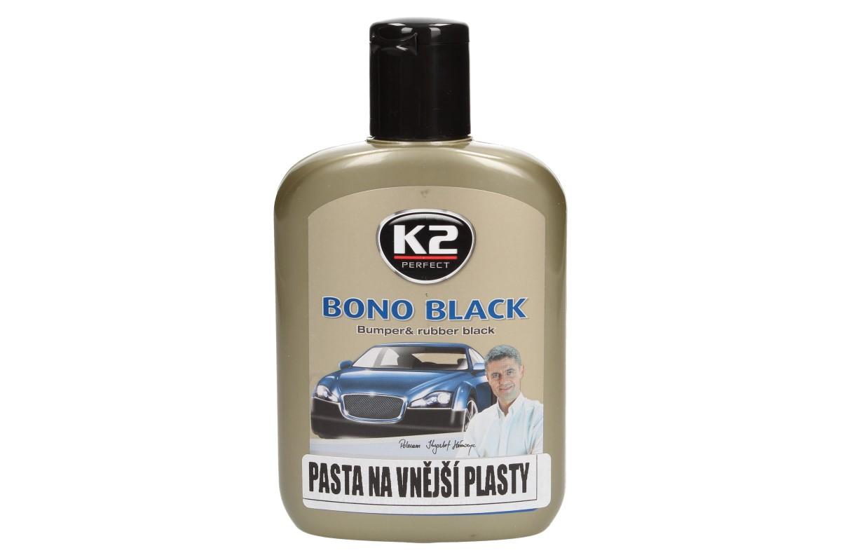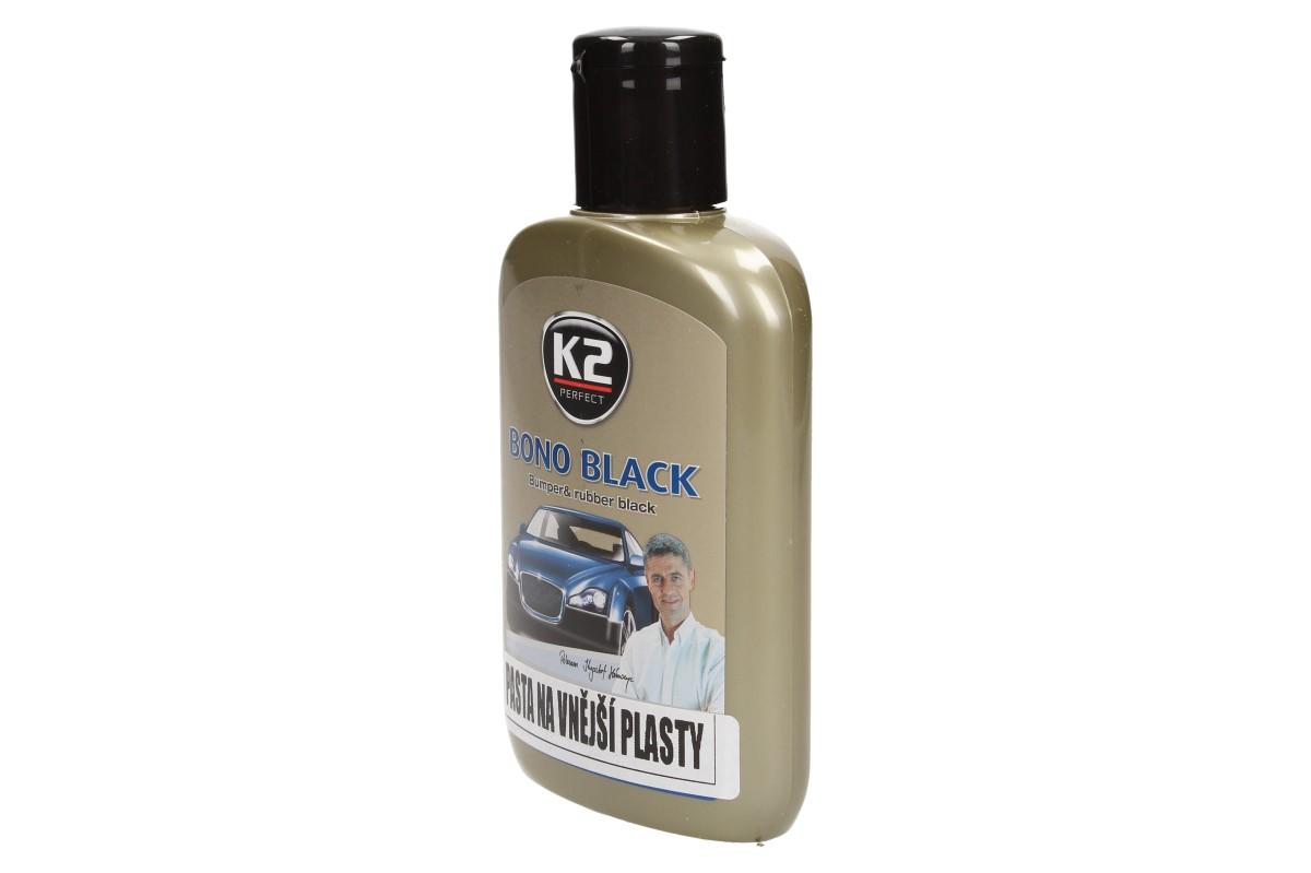 K2 Bono Black 200 ml - pasta na vnější plasty je přípravek, který chrání a obnovuje plastové části automobilu a zpomaluje jejich stárnutí. Obsahuje černý pigment, který pomůže navrátit původní vzhled i velmi zašlého povrchu. Přípravek na ochranu a zlepšení vzhledu pneumatik, pryžových těsnění a plastikových součástí zevnějšku vozu. Návod k použití: Používat pouze na plasty, pryžové části. Před použitím protřepejte. Po použití dobře uzavřete. Po několika sekundách vyleštěte.