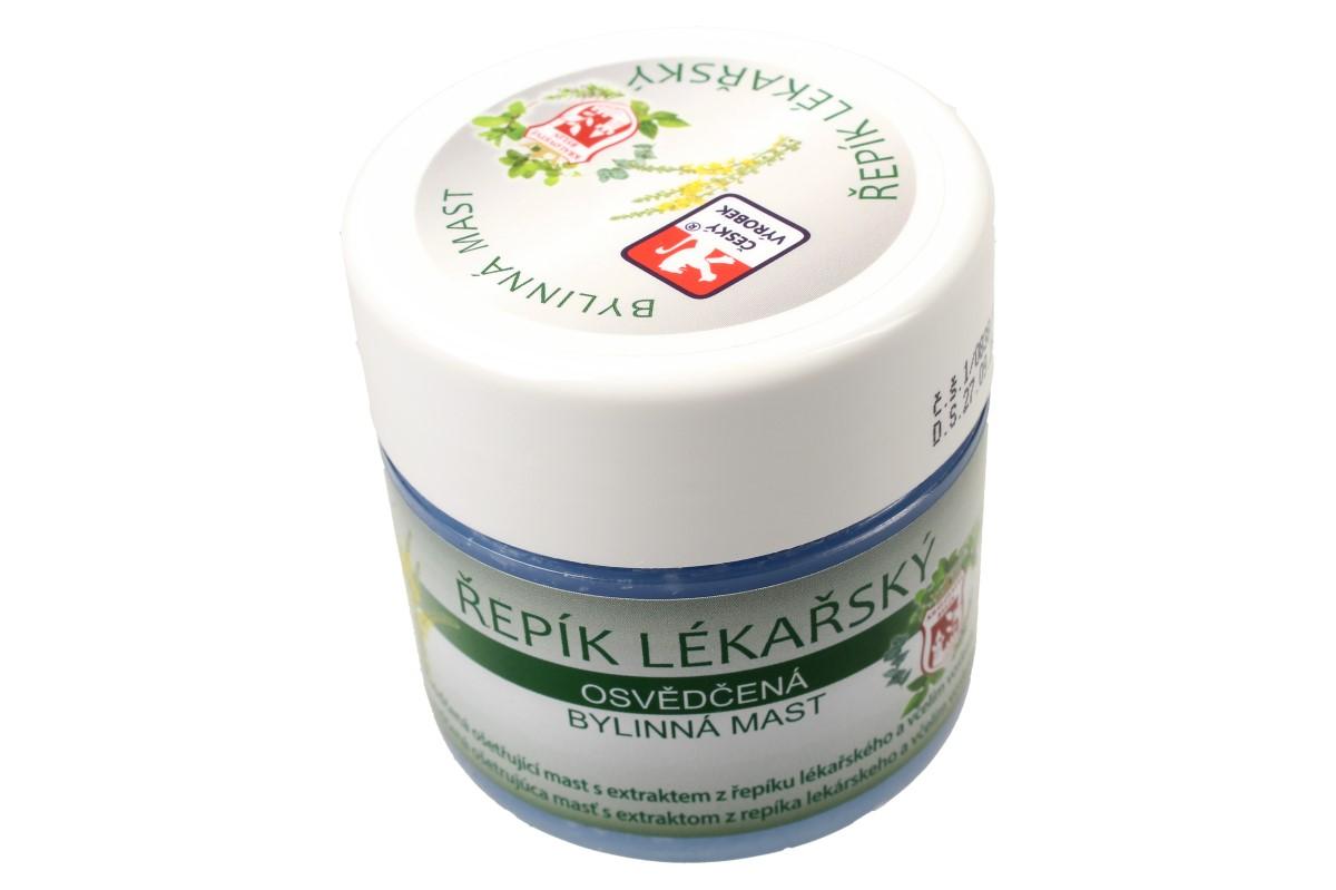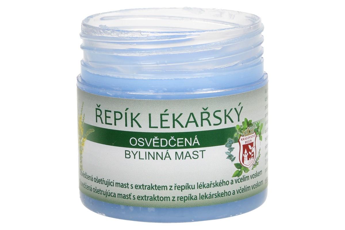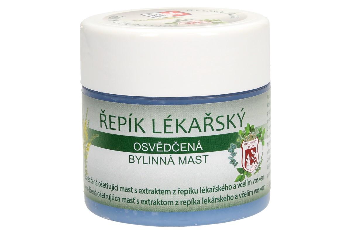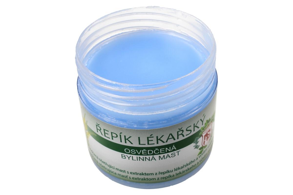 Bylinná mast 150 ml - řepík lékařský mast s výtažkem řepíku lékařského se užívá při drobných oděrkách, prasklinách a dalších kožních poškození. Je osvědčeným pomocníkem při zánětech nehtového lůžka či záděrách. Řepík je doporučován pro své protizánětlivé účinky na mokvavou a zanícenou tkáň. Návod k použití: Mast aplikujte na postižené místo několikrát denně. Pro zvýšení účinku je vhodné nanést na postiženou oblast větší množství přípravku, ovázat a nechat působit dlouhodobě – například přes noc.