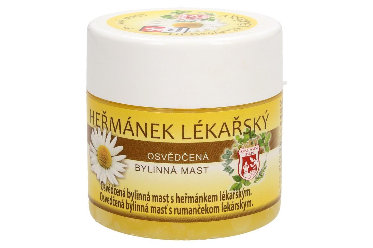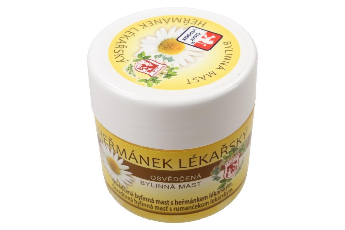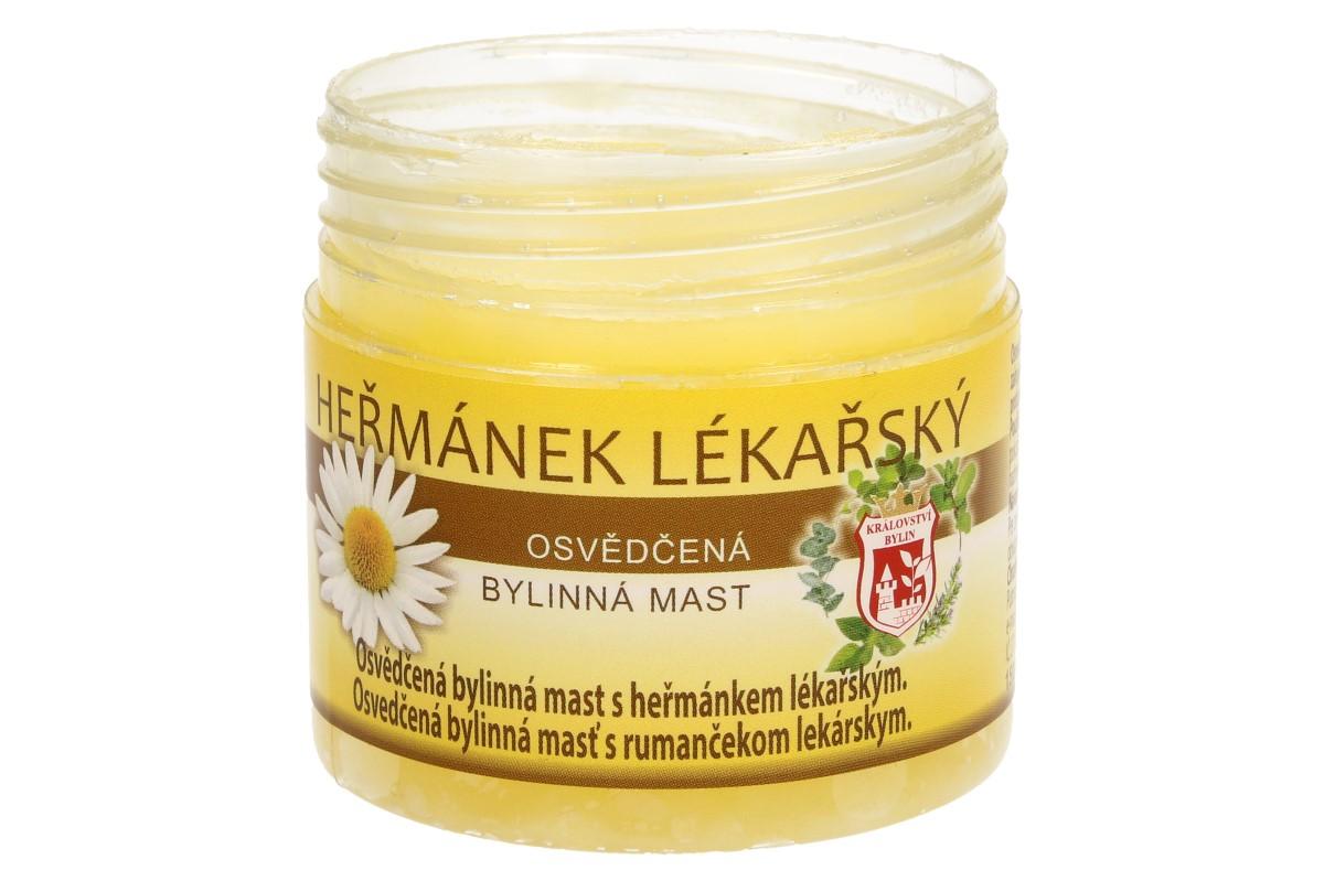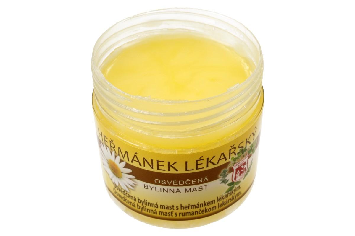 Bylinná mast 150 ml - heřmánek lékařský osvědčená bylinná mast s heřmánkem. Heřmánek lékařský má protizánětlivé účinky, působí ale i proti baktériím a virům. Heřmánková mast použití: Na podrážděnou a problematickou pokožku při akné, ochrana dětské pokožky před opruzením, ekzémem, kožní vyrážkou, pokožka spálená sluncem, pokožka ošlehaná větrem, popáleniny, odřeniny, zhnisané rány, pohmožděniny, spáleniny, podrážděná pokožka, hojení ran, špatně se hojící rány, hemeroidy, brání tvoření jizev, po nadměrném slunění. Návod k použití: Heřmánkovou mast aplikujte na postižené místo několikrát denně. Pro zvýšení účinku je vhodné nanést na postiženou oblast větší množství přípravku, ovázat a nechat působit dlouhodobě – například přes noc. Je možné kombinovat například s heřmánkovým olejem. Návod k použití: Mast aplikujte na postižené místo několikrát denně. Pro zvýšení účinku je vhodné nanést na postiženou oblast větší množství přípravku, ovázat a nechat působit dlouhodobě – například přes noc.