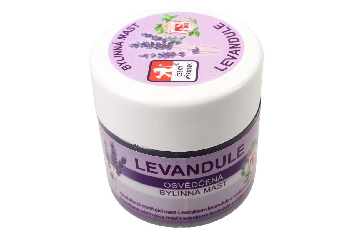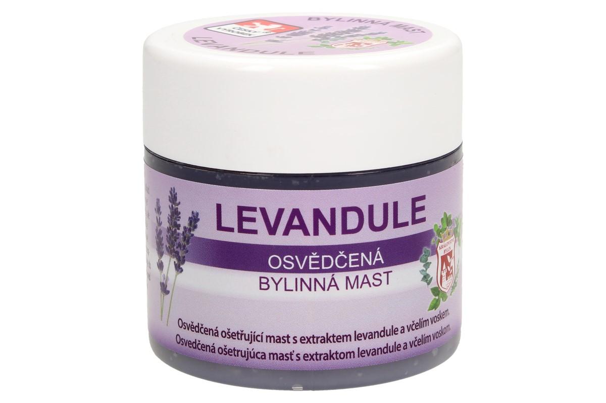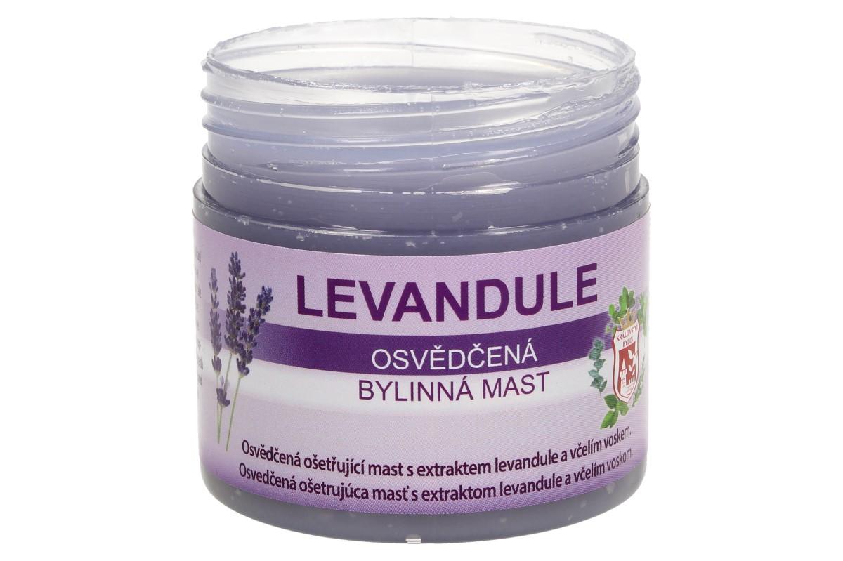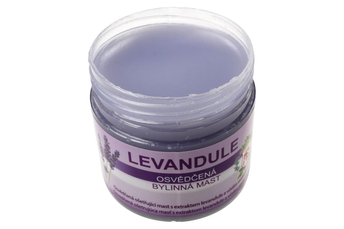 Bylinná mast 150 ml - levandule Levandulová zvláčňující a zjemňující mast je určena k čištění, regeneraci a zklidnění pokožky. Levandule má antibakteriální a antiseptické účinky a příznivě působí při aplikaci na drobná poranění kůže a kožní vyrážky. Jemná vůně levandulového oleje podporuje relaxaci a uvolnění organismu, má zklidňující a regenerační účinky nejen na pokožku, ale na celý organismus. V tradiční přírodní medicíně je levandulové aroma velmi úspěšně používáno při nespavosti, nervozitě a nejrůznějších poruchách spánku. V levandulové masti je navíc obsažen i pravý včelí vosk. Ten má výborné ochranné a hydratační schopnosti. Návod k použití: Jemně vtírejte podle potřeby i několikrát denně. Neaplikujte do otevřených ran, ale jemně vetřete do jejich okolí.