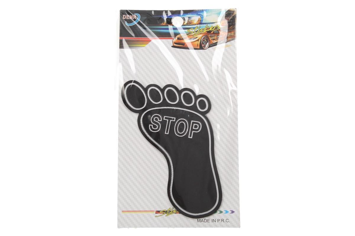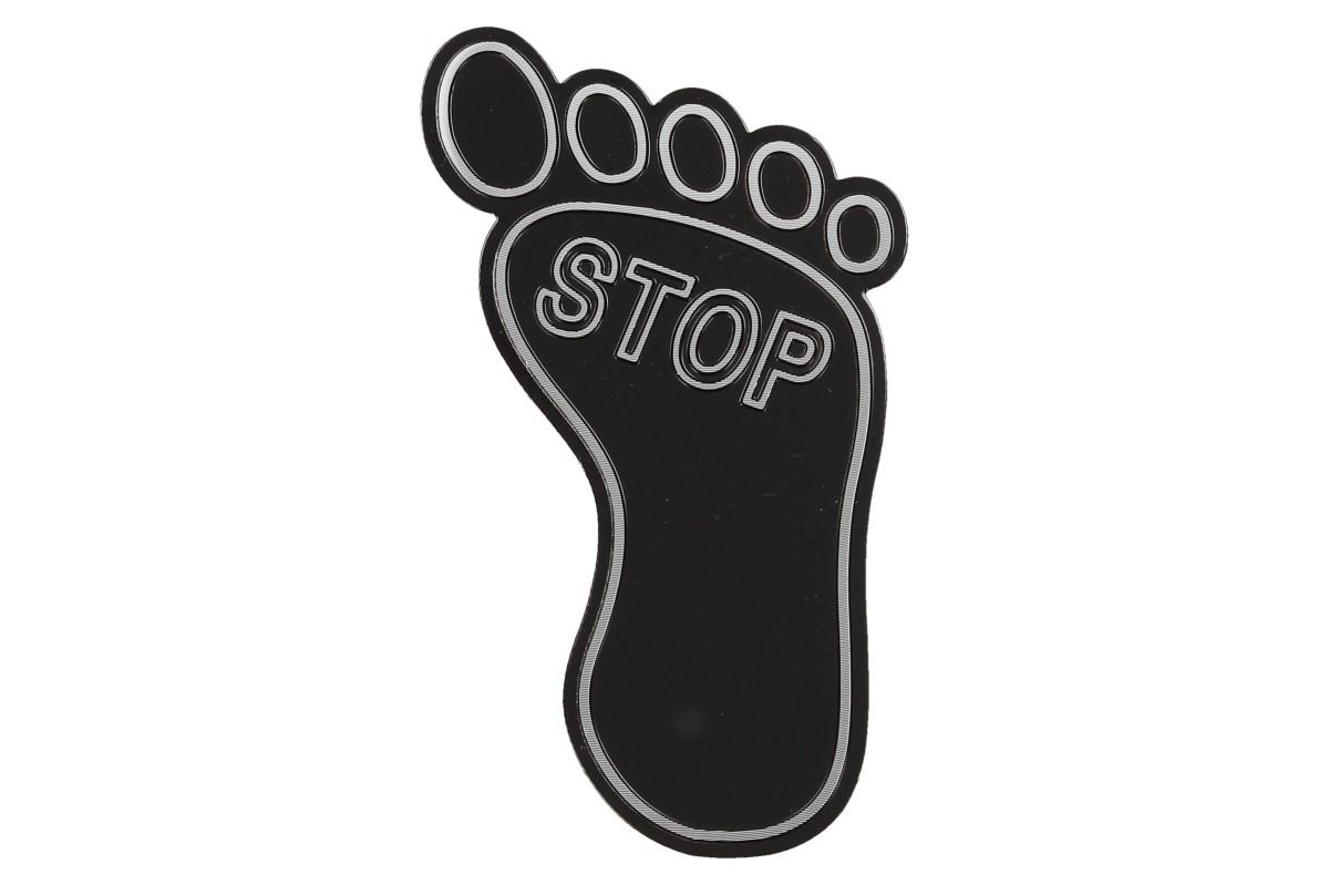 Samolepka černá ťápota STOP o rozměrech 11 x 6 cm. Je kvalitní samolepka opatřena oboustranoou lepící páskou, která neničí povrch dřeva, skla i laku na autě. Samolepka obsahuje nápis STOP. Je opatřena vrchní průhlednou ochranou folií, po nalepení samolepky na předmět, tuto ochranou folii strhněte. Samolepka je voděodolná a snadno se aplikuje. Udělejte radost svým blízkým originální a zajímavou samolepkou, která vyznačuje zákaz vstupu lidem a dětem. Lze nalepit na podlahu nebo na dveře. Dodáváno v černé barvě.
