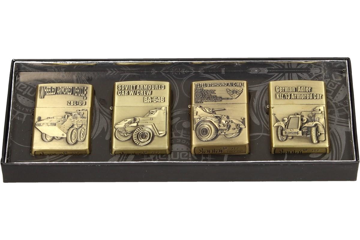 Zapalovače 4 ks - Válečné vozy jsou kvalitní a zajímavé zapalovače navrženy z ušlechtilé oceli s krásnou rytinou motivů válečných vozů. Ideální jako dárek pro milovníky historie. S těmito zapalovači uděláte zaručeně dojem na své okolí i rodinu. Benzinový zapalovač obsahuje kamínek a knot. Zapalovače z této sady můžete měnit dle vaší nálady nebo zapalovače darovat přátelům.