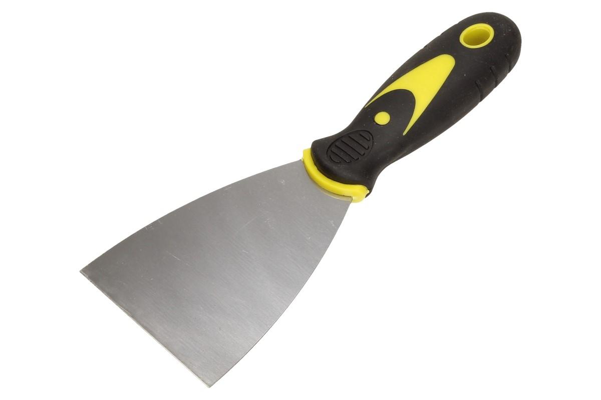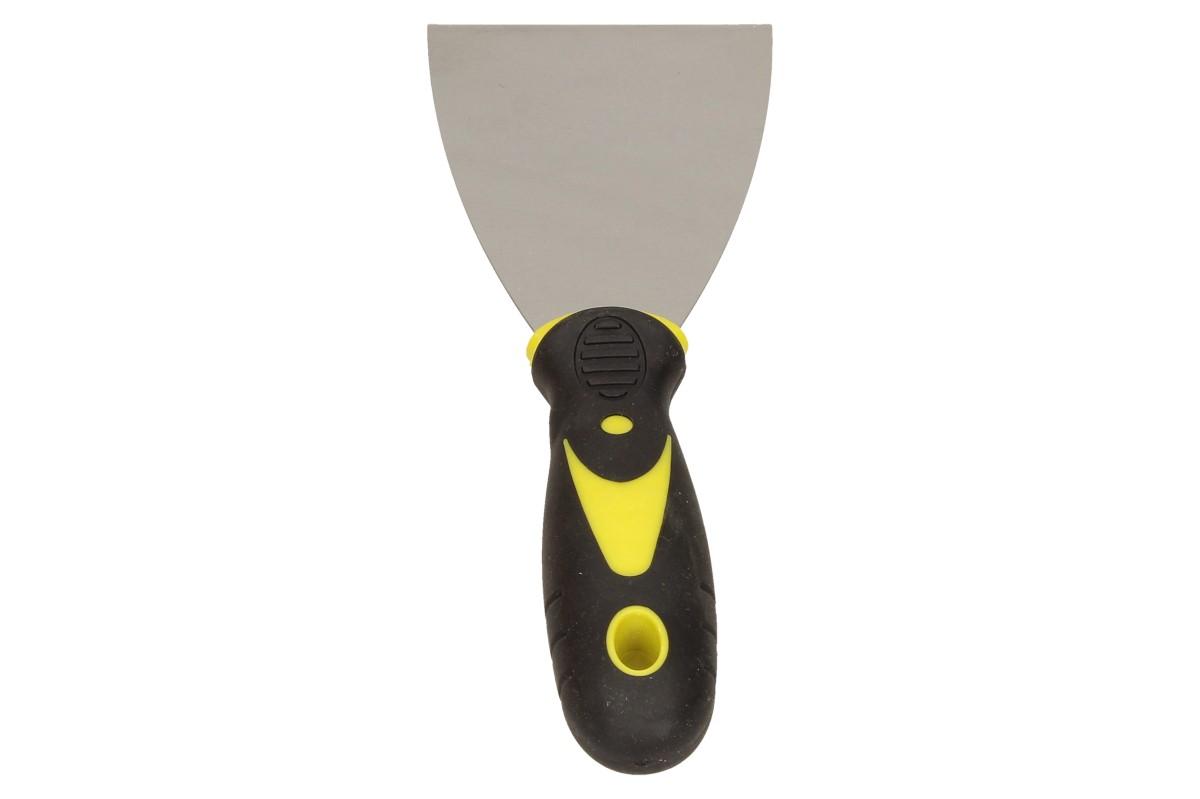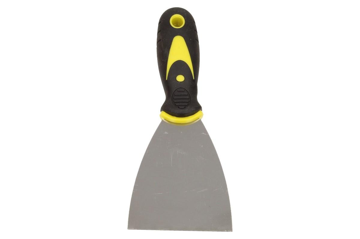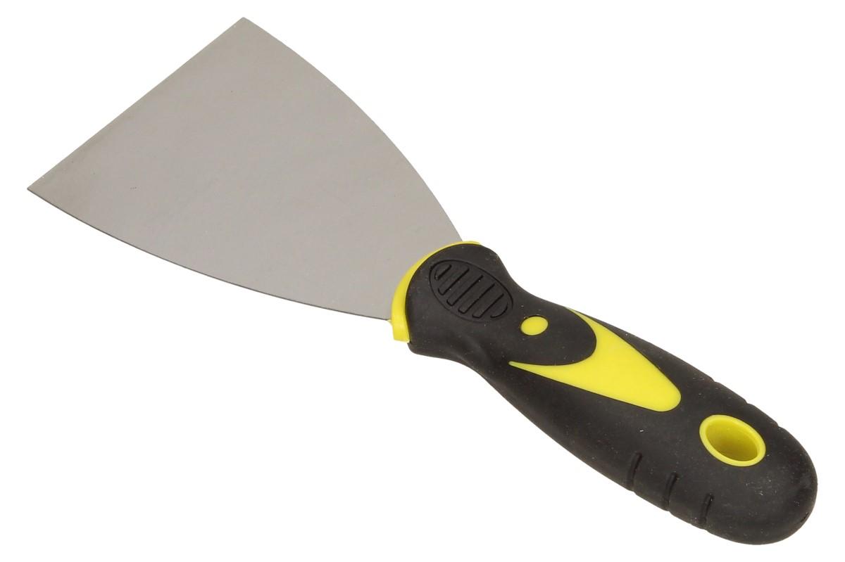 Špachtle s kovovým tělěm a pogumovanou rukojetí s protiskluzovým bodem na palec vás nenechá ve štychu při štukování, škrábání omítek, při tmelení apod.