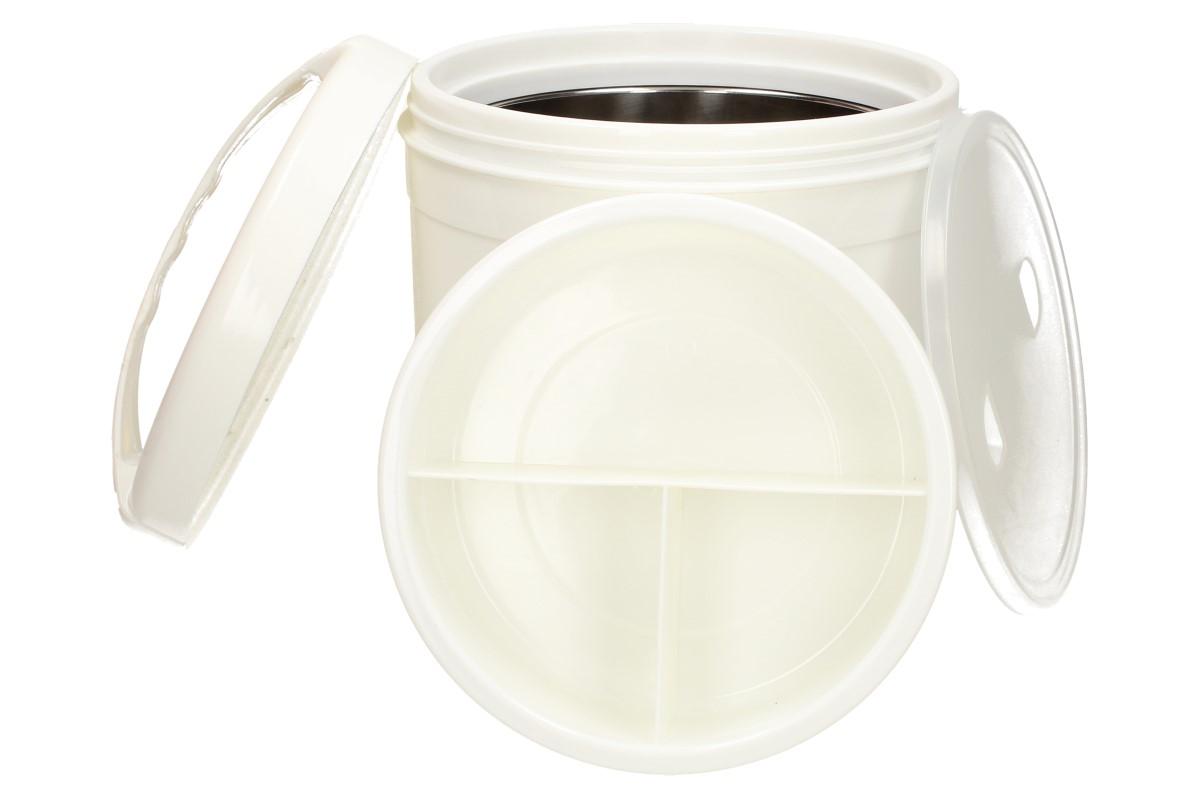 Můžete tak v míse snadno nést odděleně přílohu, různé pochutiny a dezerty nebo třeba ubrousky. Miska je dělená na tři díly. Díky termoizolační vrstvě mezi stěnami termomísa udrží konstatní teplotu pokrmu. Délka udržení teploty v nádobě závisí na okolní teplotě. Chladící efekt prodloužíte tím, že nádobu před vložením studeného pokrmu dáte cca na hodinu do ledničky. Povrch je hladký a snadno omyvatelný. Průměr misky s víčkem 19 cm, výška 7 cm. Výška vnitřku nádoby bez misky 15,5 cm, průměr 18,5. Celková výška termomísy i s úchytem je 23,5 cm.