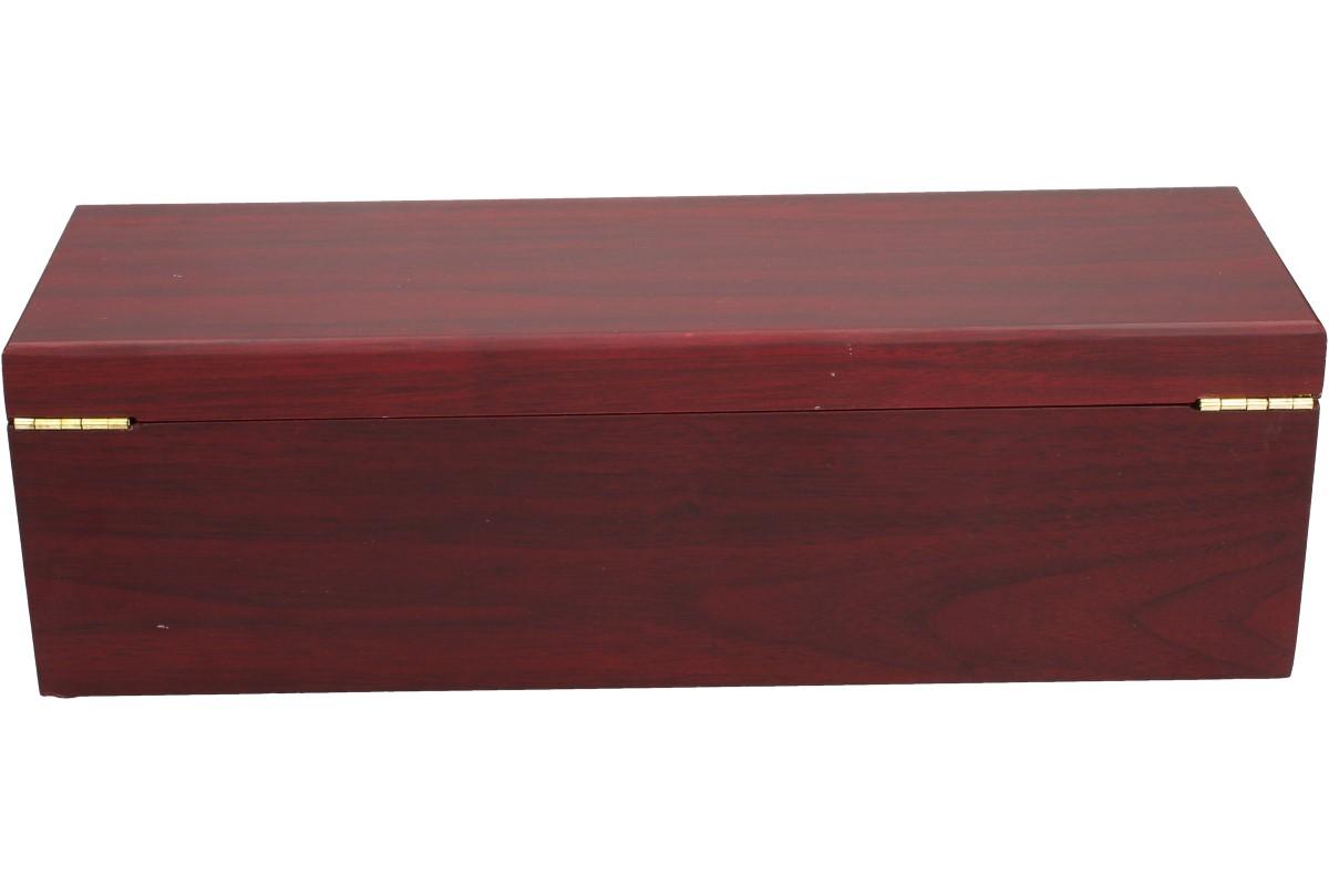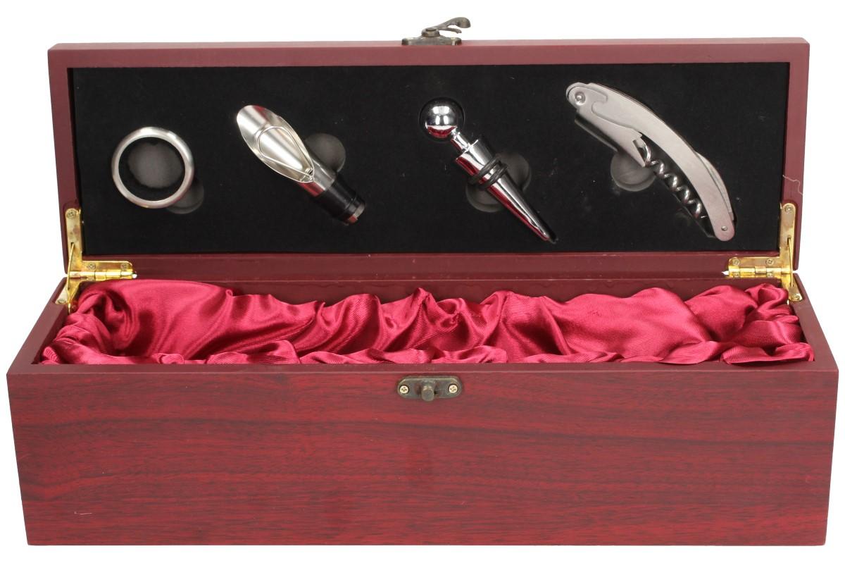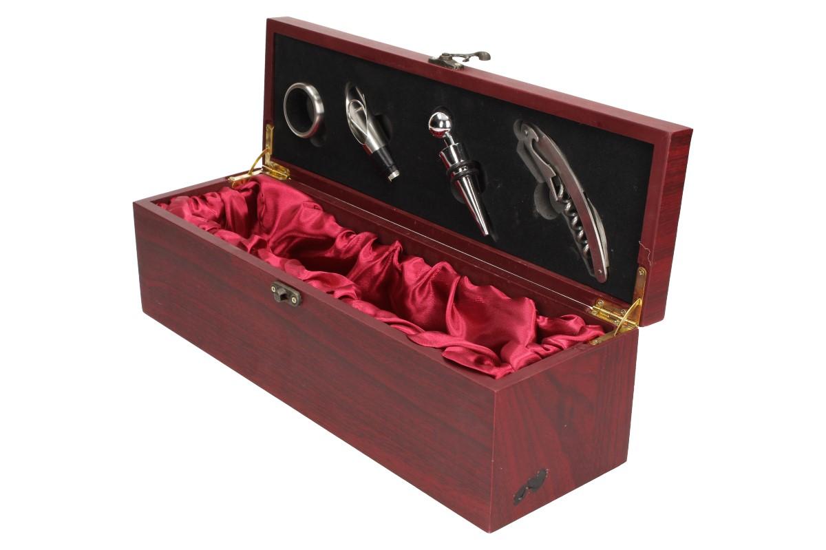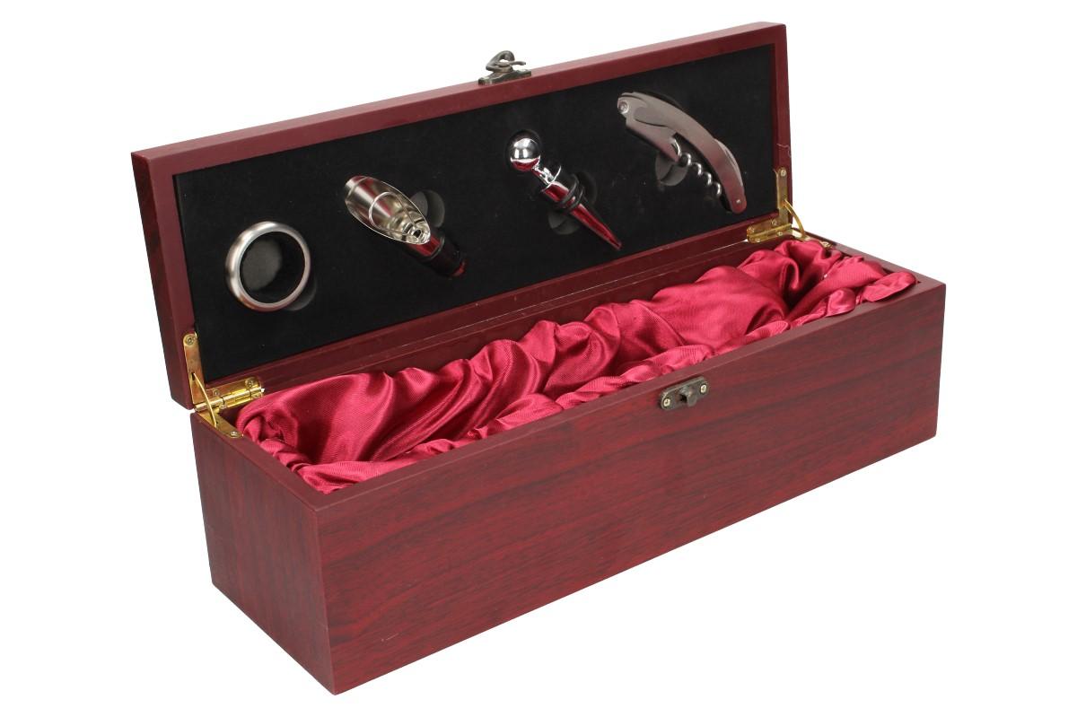 Krabice na víno v designu dřeva mahagon s příslušenstvím 5v1 obsahuje saténovou vínovou výstelku, otvírák na víno s nožíkem na ořezávání obalu, kovový špunt pro snadné zavírání a těsnící kroužek, který zabraňuje stékání vína při nalévání. Krabice je určena pro jakékoliv víno a je univerzální. Je vyrobena ze dřeva a je polepena mahogonvou dýhou. Krabice na víno má luxusní vzhled.