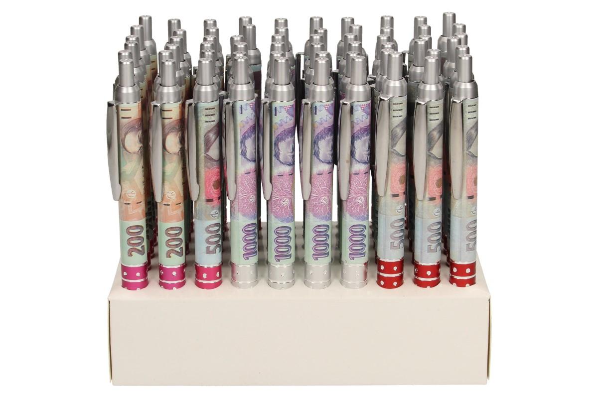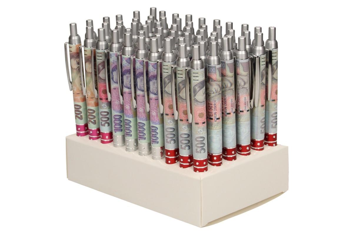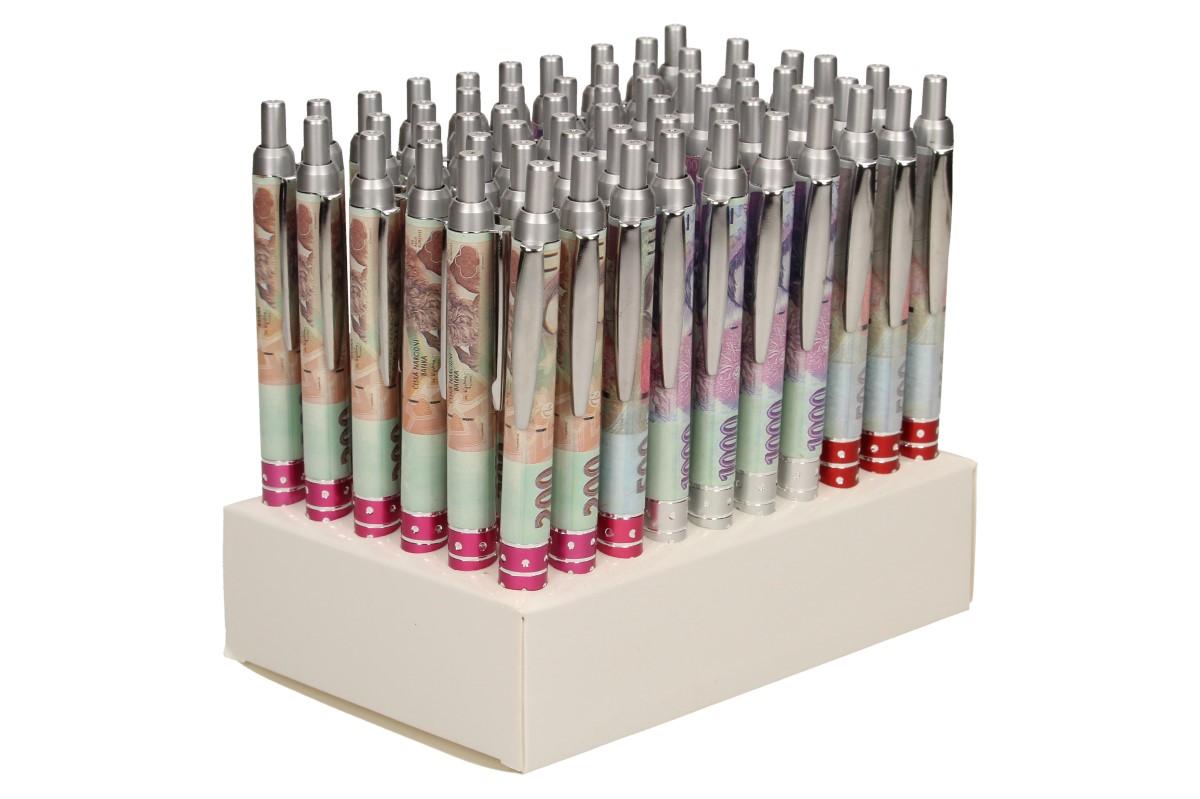 Kuličkové plastové propisky s modrým inkoustem dodáváme ve třech motivech bankovek a to: 200, 500, 1000,- Kč. Celoplastové propisky mají skosený a specielně upravený grip pro lepší úchop mezi prsty, stříbrný klip a stříbrné cvakátko.