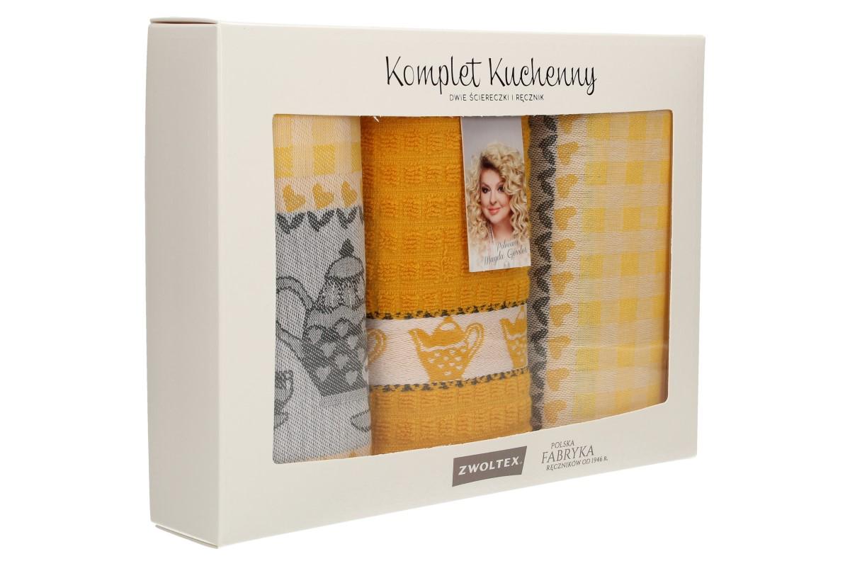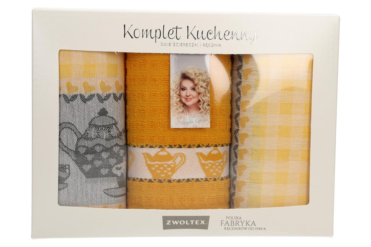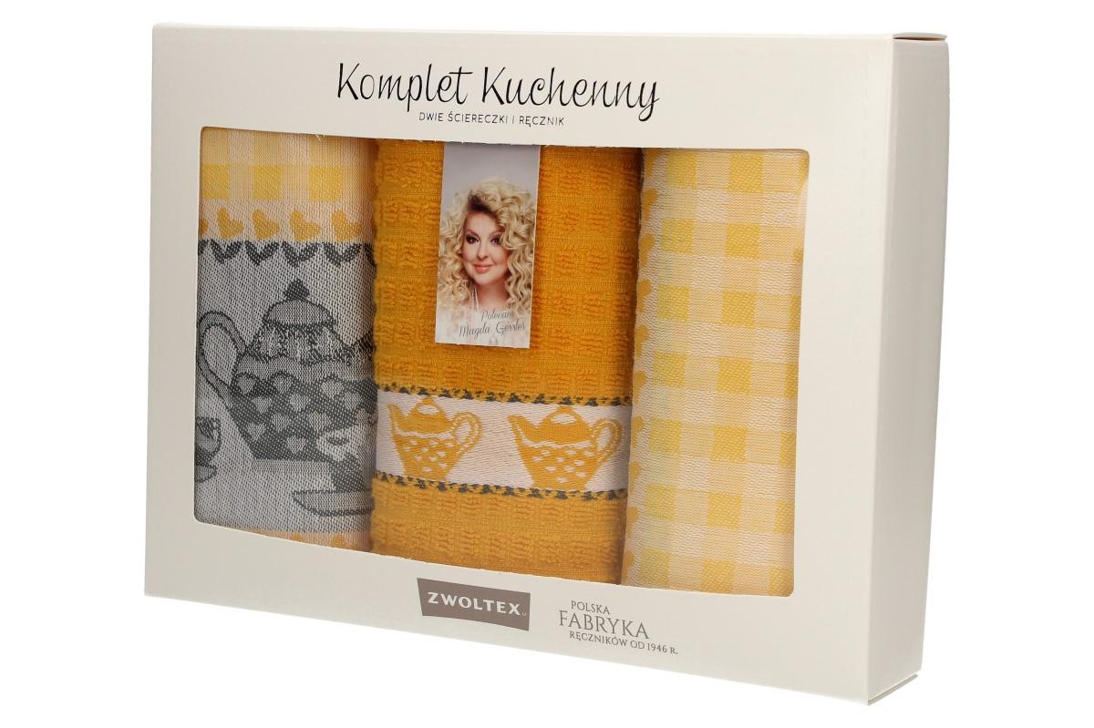 Zwoltex dárková sada kuchňských utěrek 3 kusy žlutá. Působivé dárkové balení v krabici s průhledným obalem. Sada obsahuje 2 ks utěrek 50x70 cm a 1 ks ručník 30x50 cm. Malý a efektní dárek, který určitě potěší každou hospodyňku.