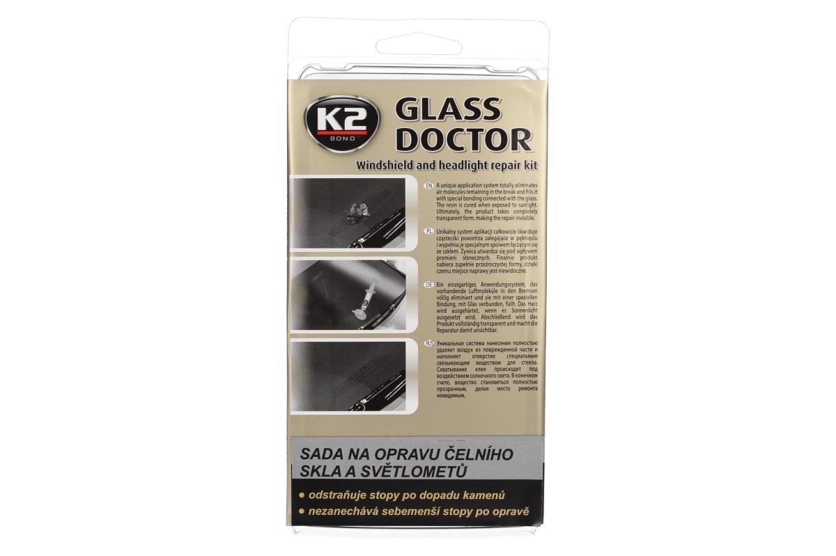 K2 GLASS DOCTOR sada na opravu čelního skla a světlometů je zcela spolehlivý výrobek na trvalou opravu všech druhů poškození čelního skla (dlouhé praskliny, bodové průrazy od kamínků atd.) Unikátní aplikační systém zcela eliminuje molekuly vzduchu, které zůstávají po rozbití skla, a vyplňuje je zvláštním spojením se sklem. Pryskyřice je vytvrzena, když je vystavena slunečnímu záření. Produkt má nakonec průhlednou formu, takže oprava není vidět. Komponenty této soupravy jsou podobné těm, které používají ve specializovaných servisech a proto jsou zárukou kvalitní opravy.