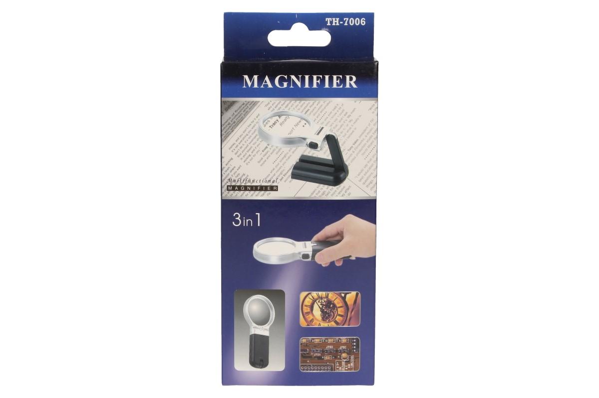 Lupa 3v1 s LED diodami je naprosto ideální pro lidi, co špatně vidí, pro sběratele známek či jiných drobných předmětů, pro zlatníky, luštitele křížovek, při navlékání nití do ouška jehly, při pájení malých elektronických součástí, obsluze telefonu, nebo televizního ovladače. Lupu si můžete také postavit na stůl a polohovat dle potřeby, Vaše ruce zůstanou volné pro Vaši oblíbenou činnost. Skleněná čočka zaručí dokonale ostré přiblížení a LED diody zaručí lepší a viditelnější přečtení i v noci. Napájení: 2x AA baterie (baterie nejsou součástí balení).