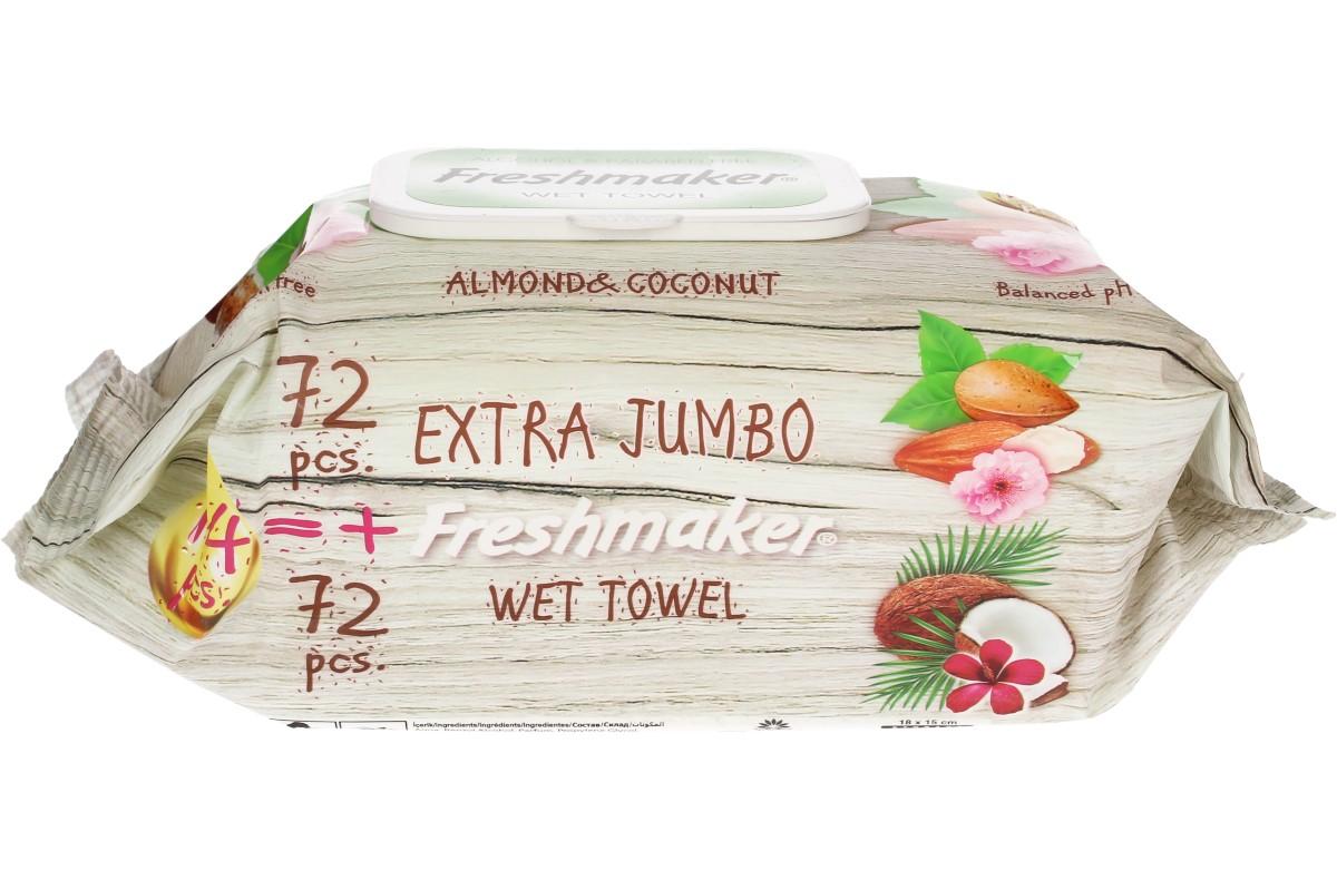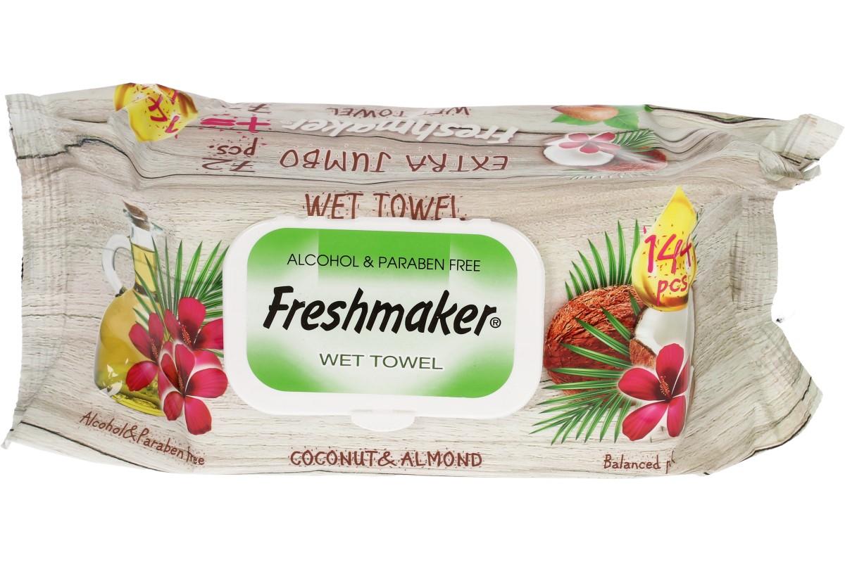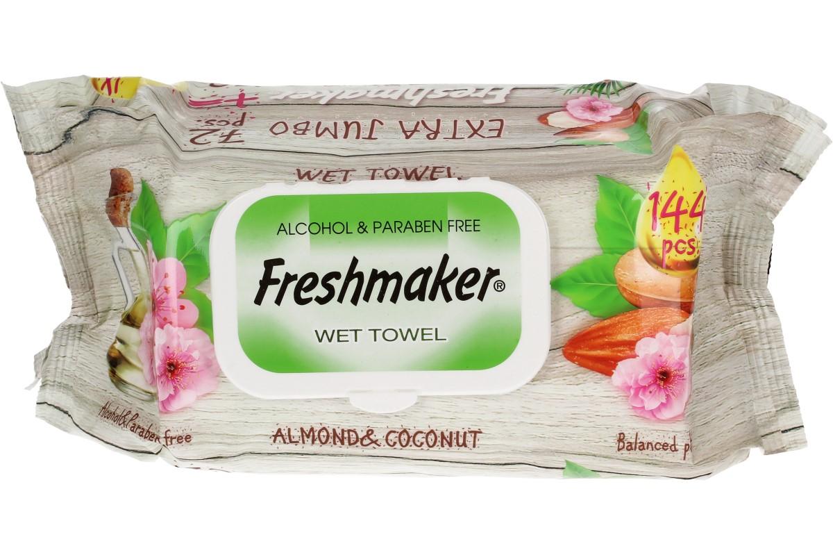 Freshmaker vlhčené ubrousky 144ks Coconut & Almond, pružné vlhké ubrousky, které neobsahují alkohol, jsou hygienické, čistí, hydratují a vyživují pokožku. Balení je rozděleno na dvě části po 72 kusech ubrousků, v horní vrstvě se můžete těšit na jemnou vůni mandlí a v té druhé zase na svěží kokos. Freshmaker vlhčené ubrousky jsou extra pevné, sametové a měkké.