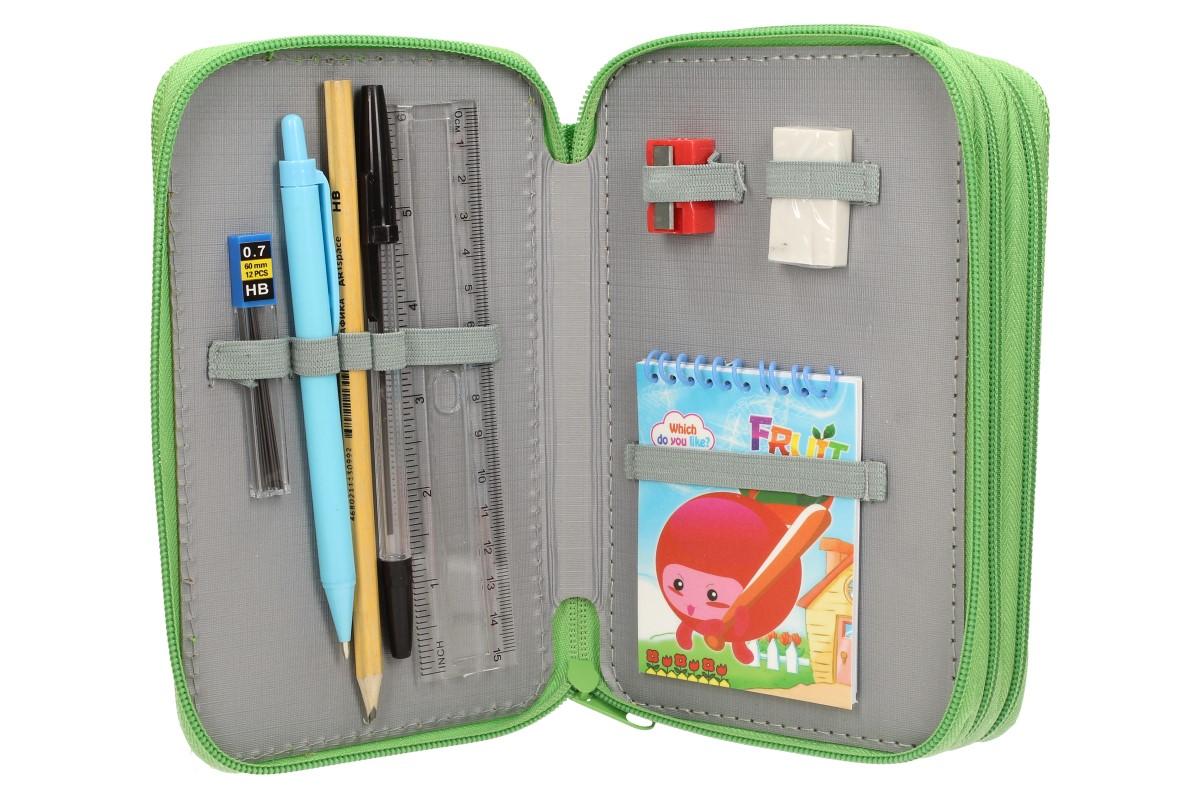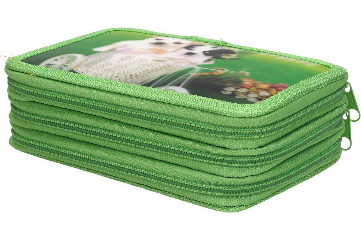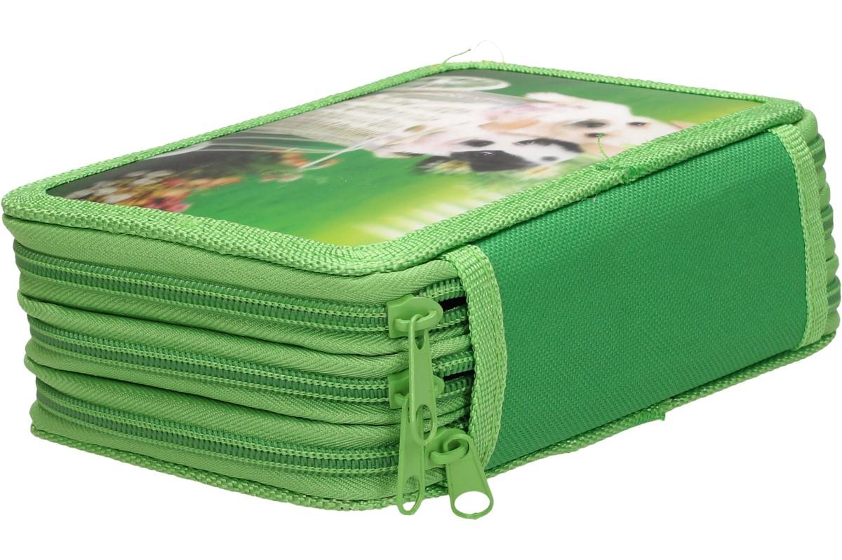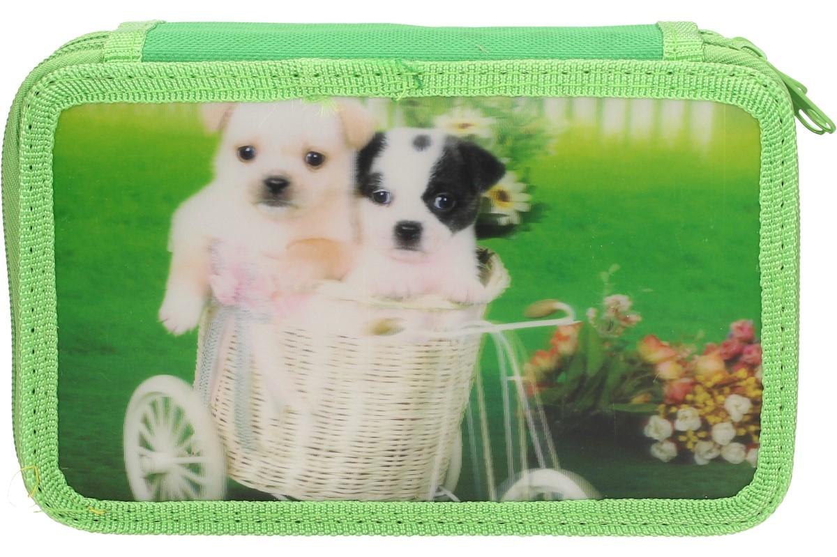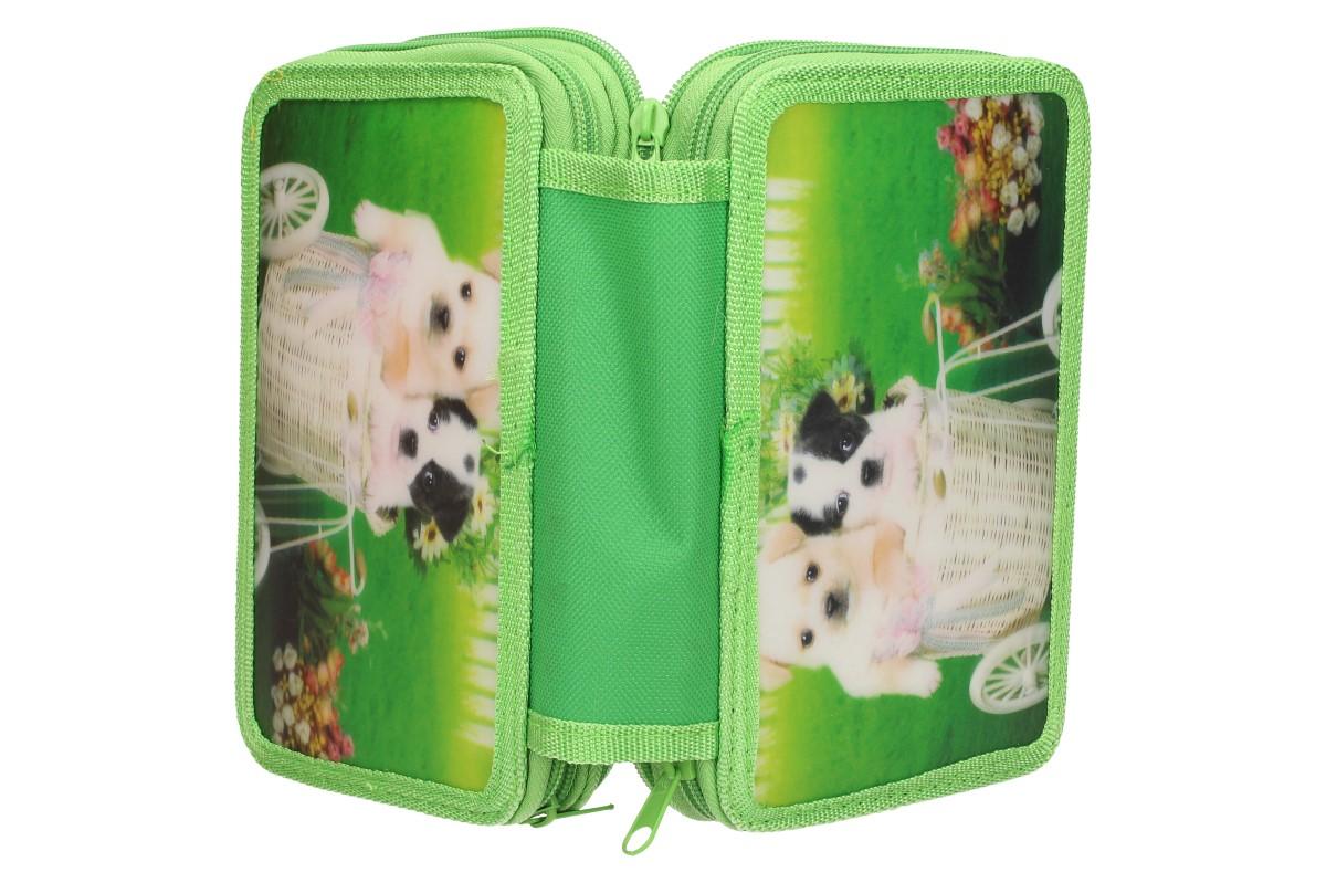 Kompletně vybavený školní penál s 3D obrázkem psů potěší každého školáka. Třípatrový penál má zavírání na zip a obsahuje kompletní 32 dílnou výbavu, kterou žák bude ve škole potřebovat. V penálu naleznete tuhy do pentilky, pentilku, černou propisku, pravítko, ořezávátko, gumu, malý bloček který může posloužit jako úkolníček, 12 fixů základních barev a 12 pastelek.