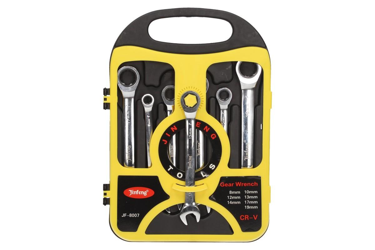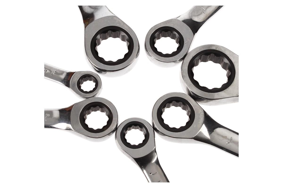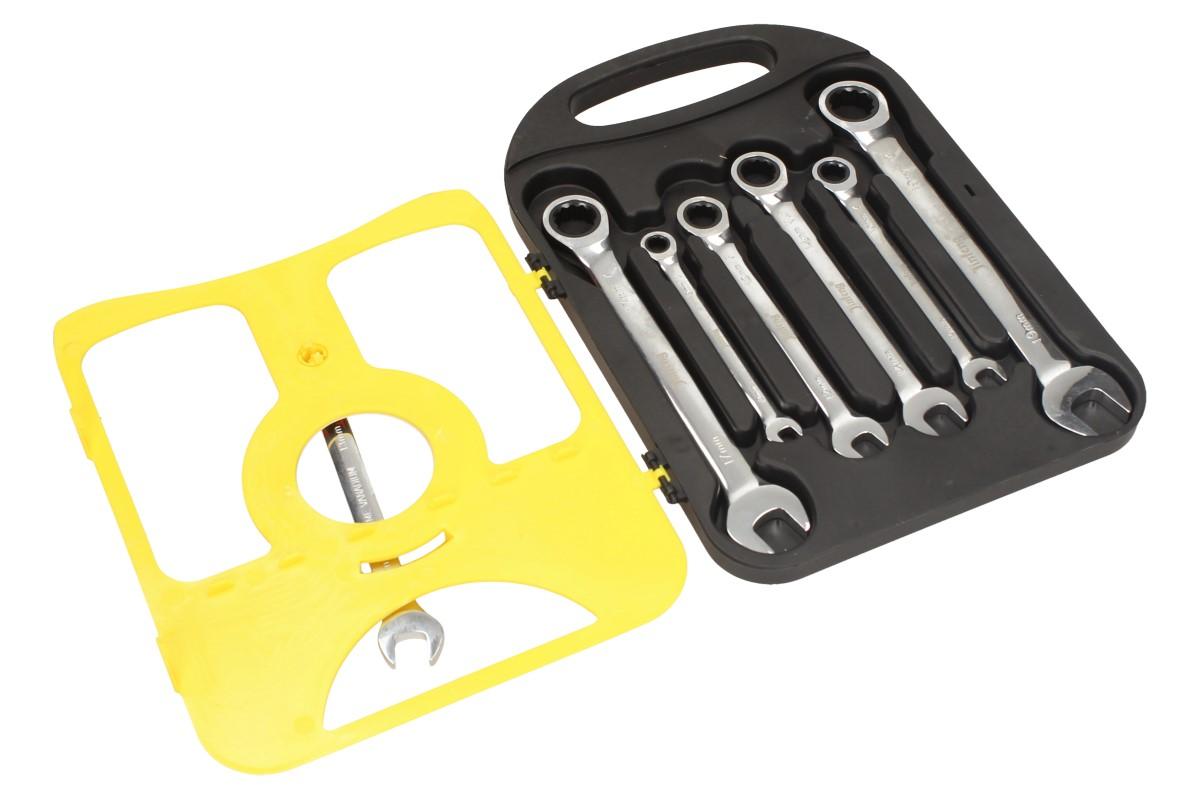 Sada očkoplochých klíčů s ráčnou s jsou vyrobené z kvalitní chrom-vanadové oceli, mají štíhlé leštěné hlavice, očkovou přepínatelnou ráčnu a chromovaný povrch. V sadě naleznete 7 klíčů různých velikostí, ketré jsou dodávány v kvalitním plastovém pouzdře, které lze snadno přenášet. Kvalitní kontstrukce z CRV oceli v kobminaci s kvalitní ráčnou jsou nepostradatelným pomocníkem při povolování zrezlých a zničených šroubů. Tato sada udělá radost každému správnému kutilovi.