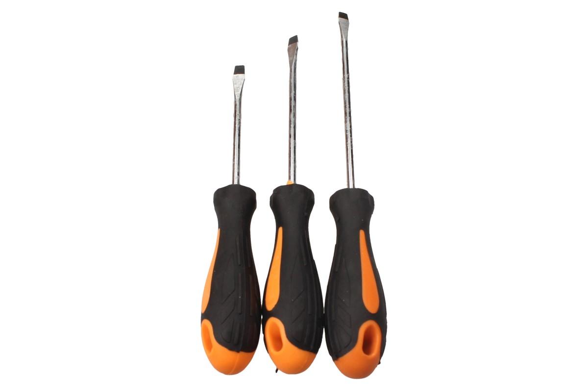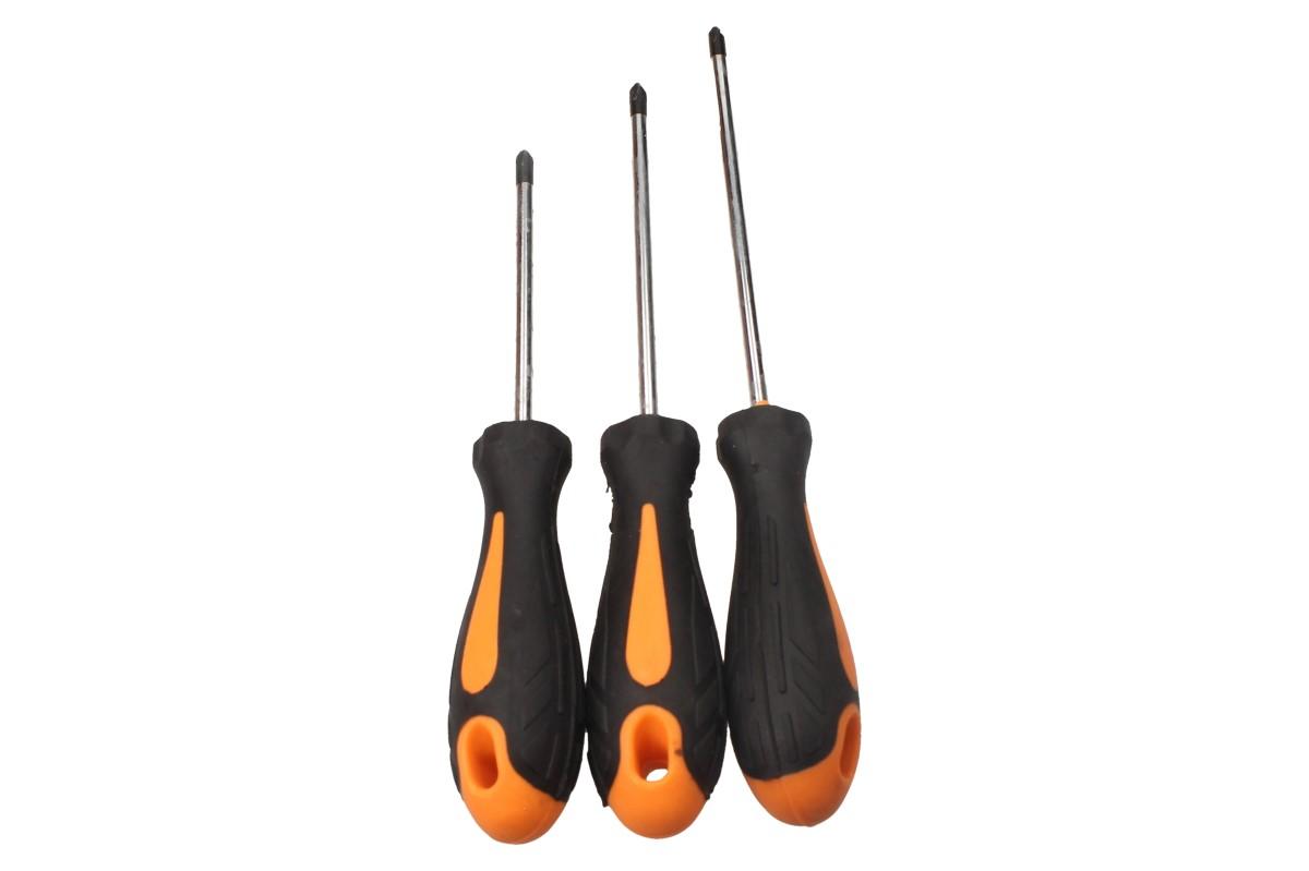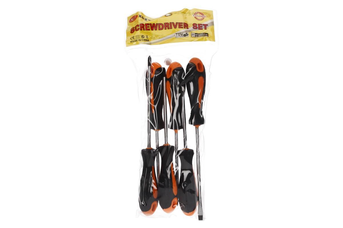 Sada šroubováků 6 kusů se bude vyjímat v každé dílně, autoservisu nebo garáži každého kutila. Šroubováky mají ergonomicky tvarované gumové rukojeti s protiskluzovou úpravou pro pohodlný a bezpečný úchop. Dříky jsou vyrobeny z chrom-vanadové oceli a každý šroubovák má černý tvrzený magnetický hrot. Zaoblený konec rukojeti umožňuje rychlé protáčení v dlani.