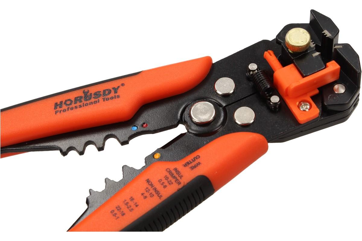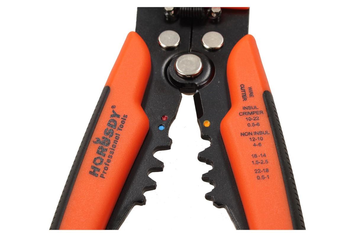 Automatické, samonastavovací, odizolovací kleště Horusdy 5v1. Řezejte, krimpujte, odizolujte vaše vodiče. Kleště se vám přizpůsobí! Kleště disponují samo-nastavitelnými čelistmi, které jsou ideální pro měděné a hliníkové dráty od 10 do 24 AWG (0,2 až 6 mm). Plastová pogumovaná rukojeť poskytuje maximální pákový efekt, zajišťuje grip, zvyšuje pohodlí a snižuje únavu rukou. Speciálné konstruované a precizně opracované zuby čelistí uchopí, drží a odstraní vnější plášť jednoduchým pohybem rukou. Kleště jsou velmi vhodné pro krimpovaní spojů.
