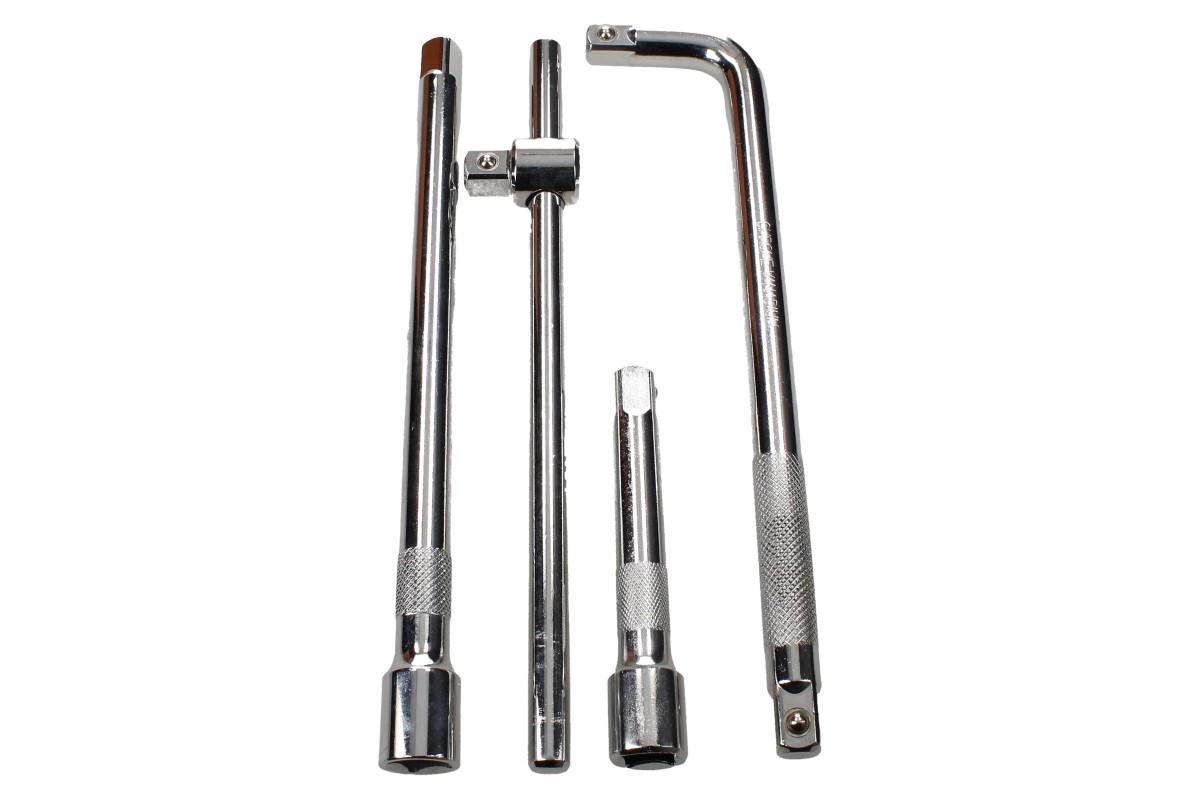 Naše sada nástavců na velkou ráčnu chrome vanadium obsahuje čtyři nástavce, či nástroje pro práci s ráčnou a oříškovými nástavci. Na naší sadu se můžete vždy spolehnout, protože je vyrobená z celosvětově uznávané chrom-vanadiové oceli, která získala už několik ocenění pro svoji výdrž a pevnost. Součástí balení: malý nástavec- délka 12cm, velký nástavec- délka 25cm, zahnutý trhák- délka 25cm a nastavitelné vratidlo o délce opět 25cm. Celá sada je na klasickou velikost velké ráčny, kterou má již každý doma. Pokud vy ji ještě nemáte, můžete koupit zde: