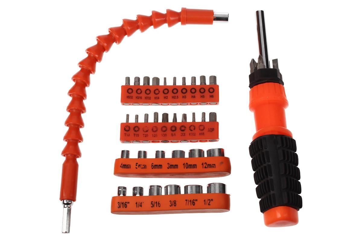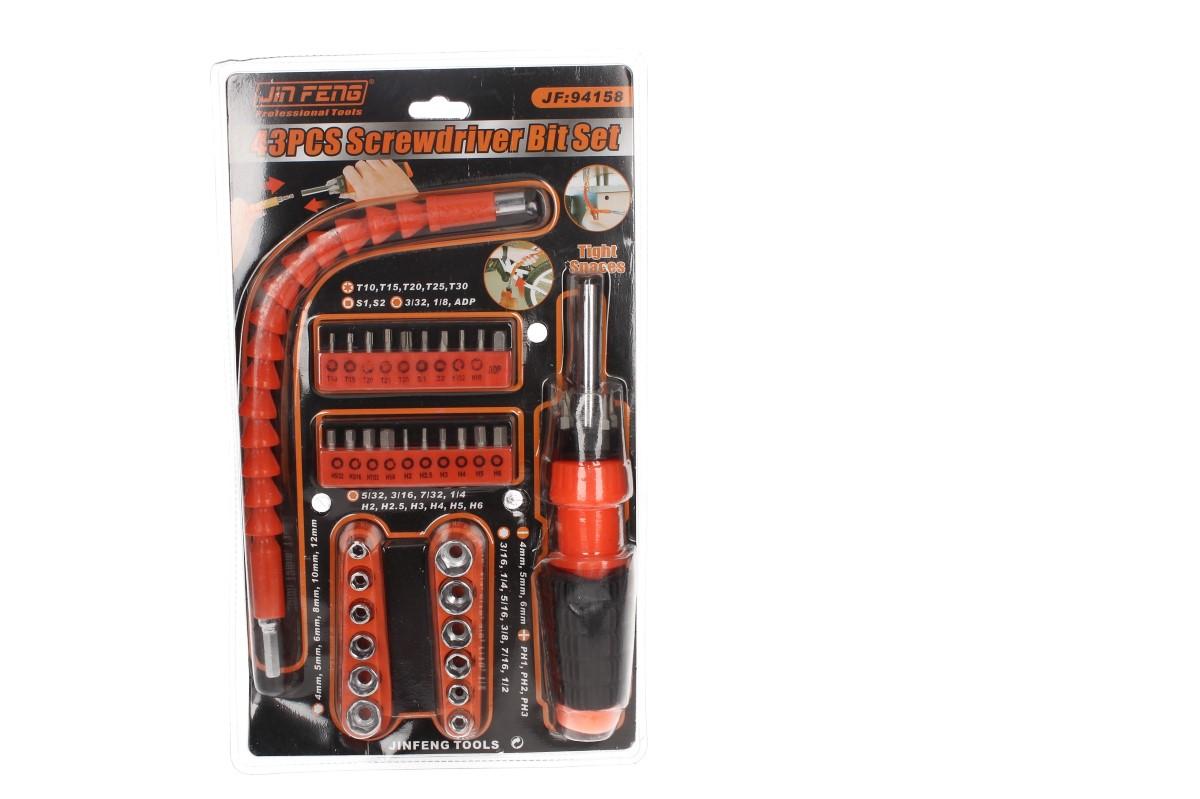 Multifunkční šroubovák s 43 bity je perfektní multifunkční výbava do vaší dílny, do auta pro případ nouze, nebo na stavění nábytku pokud se nechcete zaobírat jednorázovými nástroji. Sada obsahuje šestihranné oříšky 4-12mm ale i americké 3/16" - 1/2". Hvezdičky t10-t30, imbus h2-h6, čtverce S1 a S2, dva ploché bity a tři křížové. Samotný šroubovák má kvalitně pogumovanou rukojeť a skvělý ohýbatelný nástavec, který vám zajistí přístup kamkoliv. Bity dodávané v gumových pouzdrech.