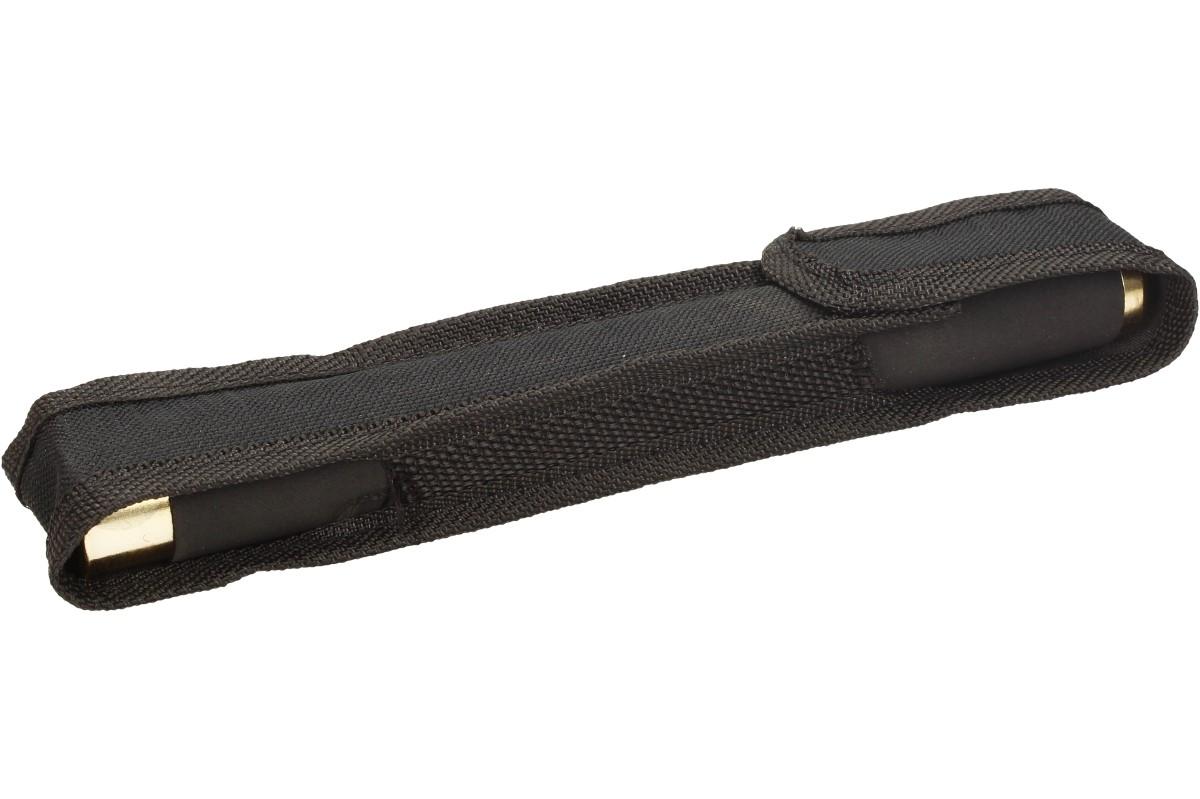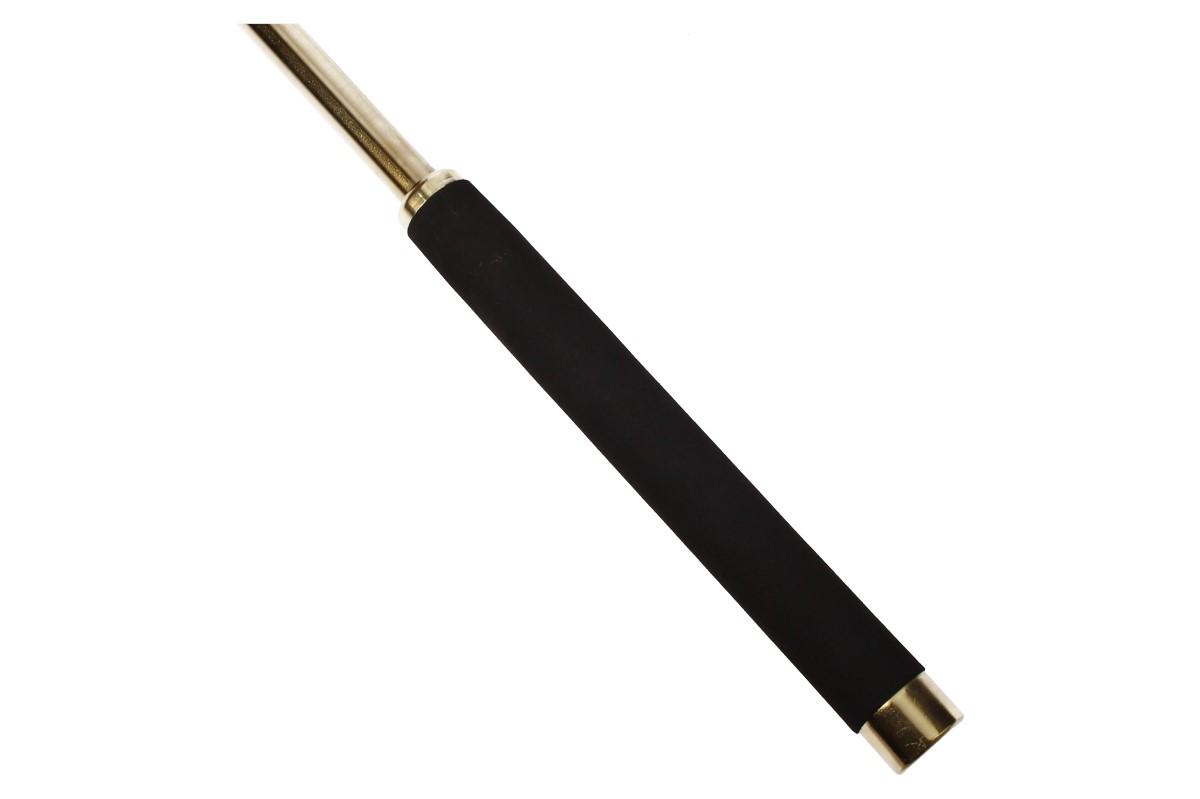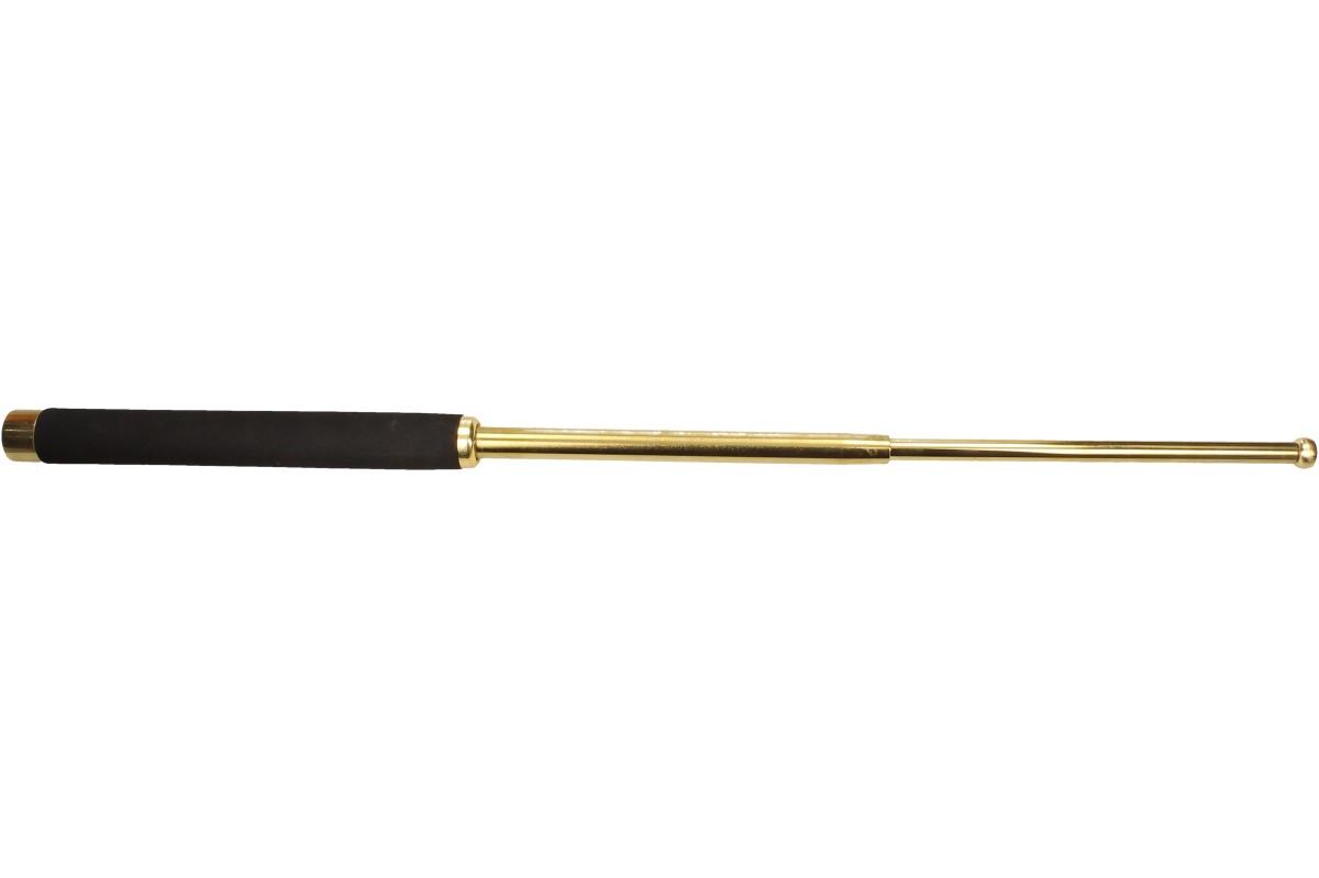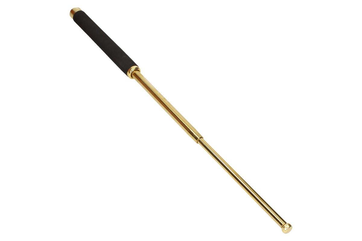 Teleskopický obušek E26S 65 cm s pouzdrem. Krásný zlatý design obušku si zamilujete na první pohled. Teleskopický obušek se skládá ze tří ocelových trubek zasunutých v sobě, nejmenší (přední) trubka prochází ostatními až do koncovky obušku kde je její konec jištěn třením o perko proti samovolnému otevírání obušku. Prudkým švihnutím se obušek rozloží do plné délky, zde dojde k tzv. frikční aretaci trubek, kdy se do sebe zaseknou kuželové plochy na koncích trubek. Složení se provádí rychlým úderem volně obušku volně uchopeného za konec kolmo k tvrdému povrchu. Pokud obušek nelze složit, několikrát důrazně poklepeme vodorovně obuškem o tvrdou podložku. Příjemnou a pohodlnou manipulaci s obuškem zajišťuje rukojeť pokrytá pěnou. Tím se kužely uvolní a následně můžeme obušek zavřít.