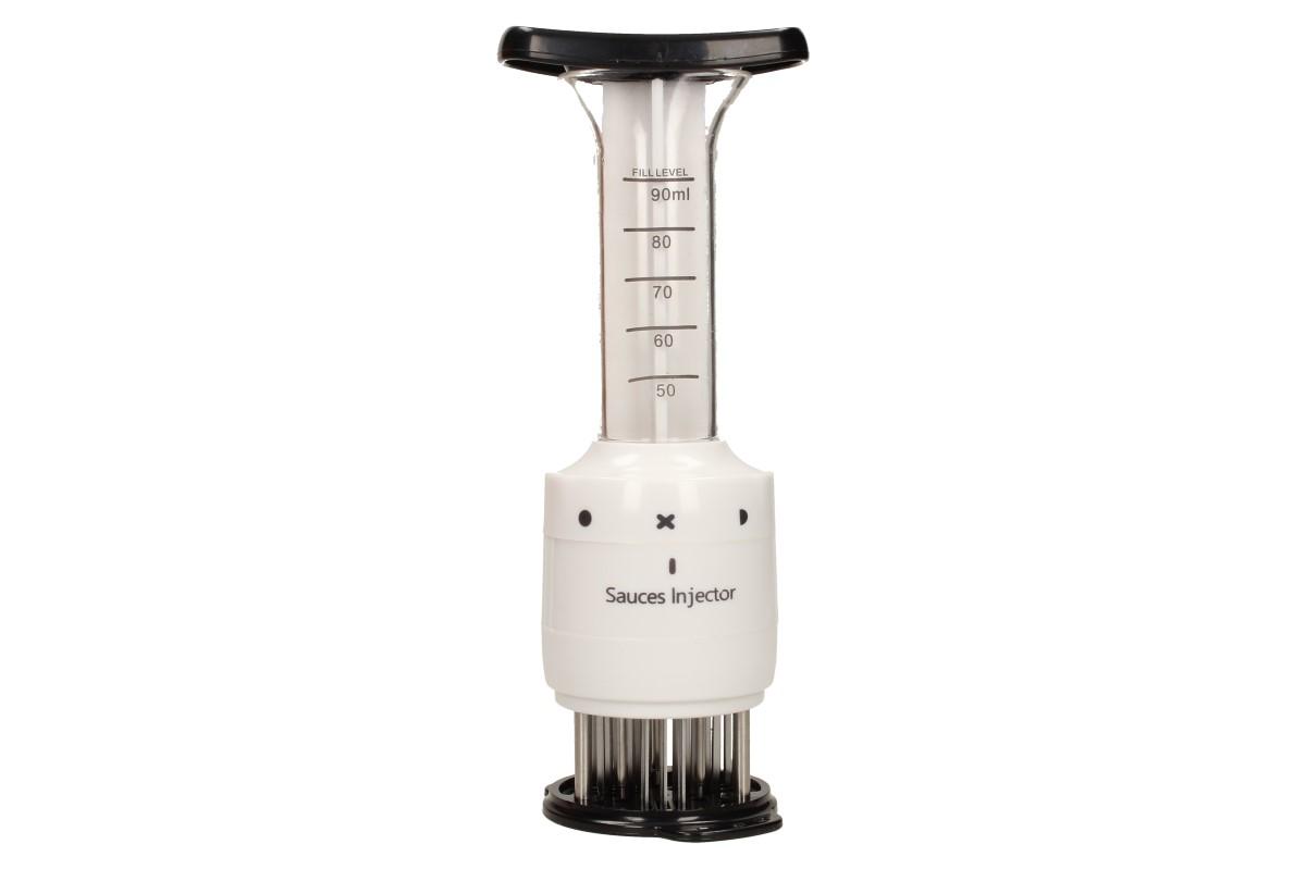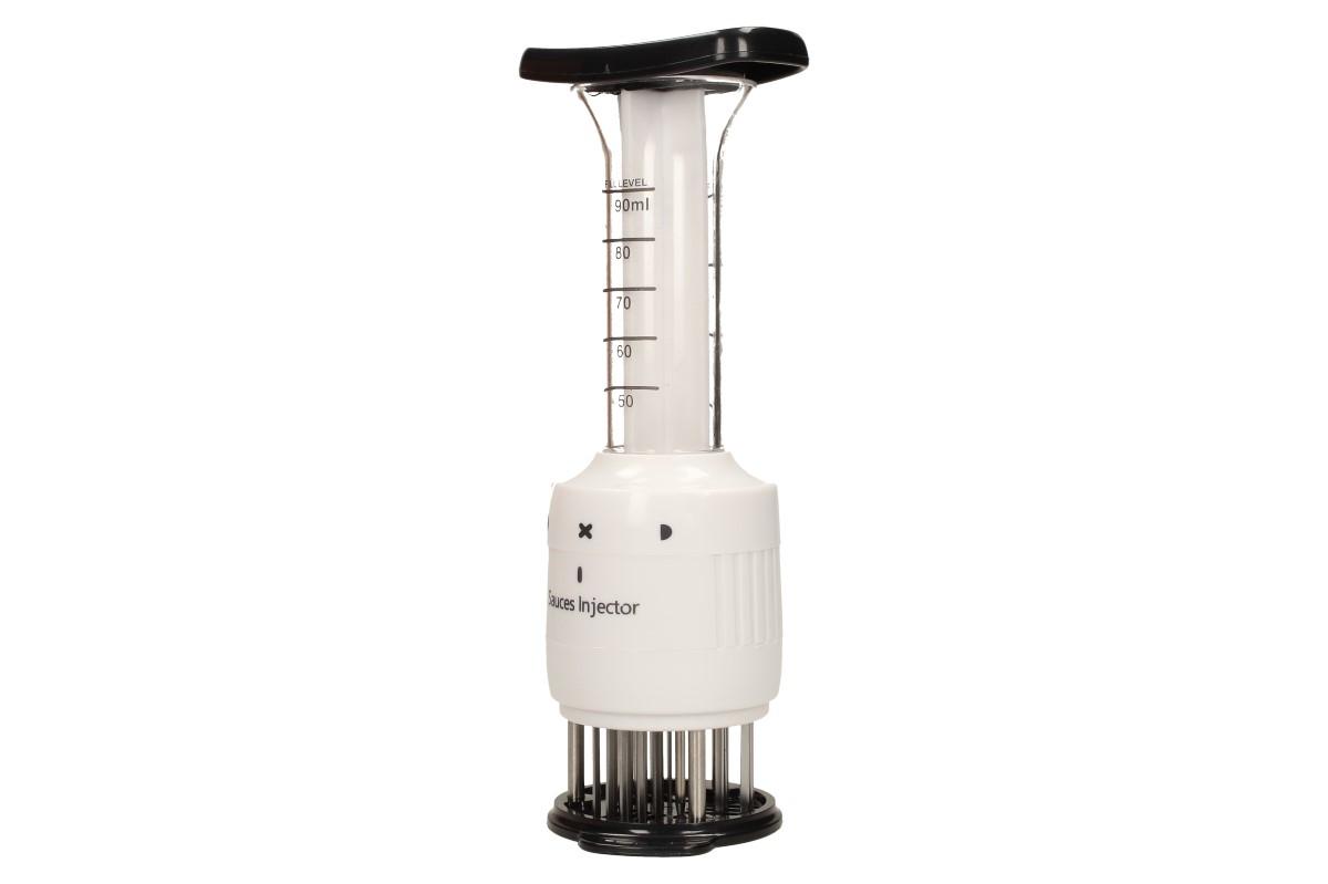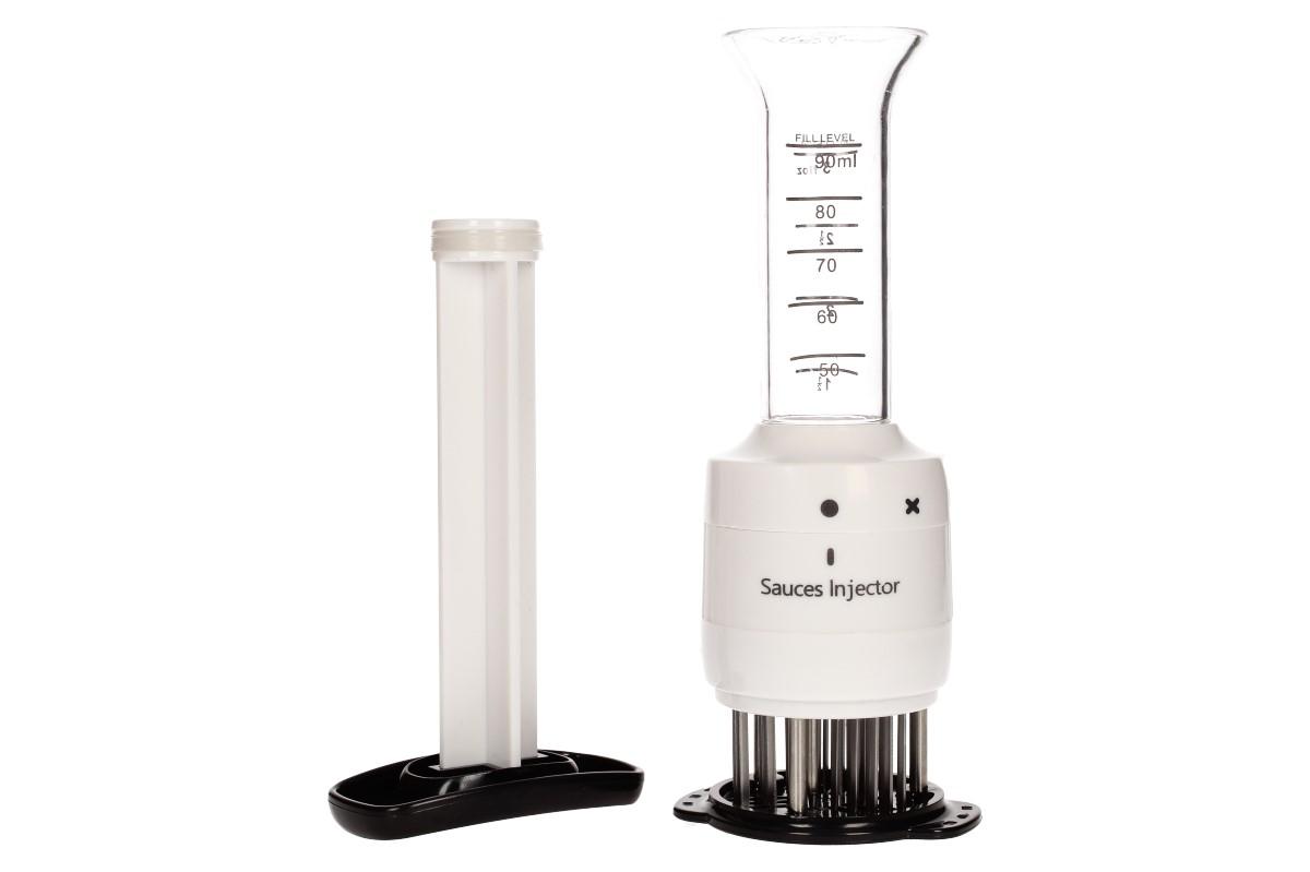 Tenderizér na maso se vstřikovačem marinády pronikne i tuhým masem, díky 30ti nerezovým jehlám. Stačí několikrát stlačit a jehly vytvoří malé kanálky uvnitř masa, které umožňují rovnoměrné pronikání tepla, což má za následek mnohem šťavnatější a chutnější maso. Tenderizér má nádobku o objemu 90 ml (3 floz), díky které můžete maso součastně dochucovat. Čepele se vysunou pouze při lisování do masa a po zvednutí se automaticky zatáhnou, aby byla zajištěna bezpečnost. Kupte si tento tenderizér a vychutnejte si hlubší proniknutí marinád až o 40%, kratší dobu vaření a rovnoměrně udělaný steak. Můžete jej použít na hovězí, krůtí, telecí, kuřecí, vepřové, steak, ryby, atd.