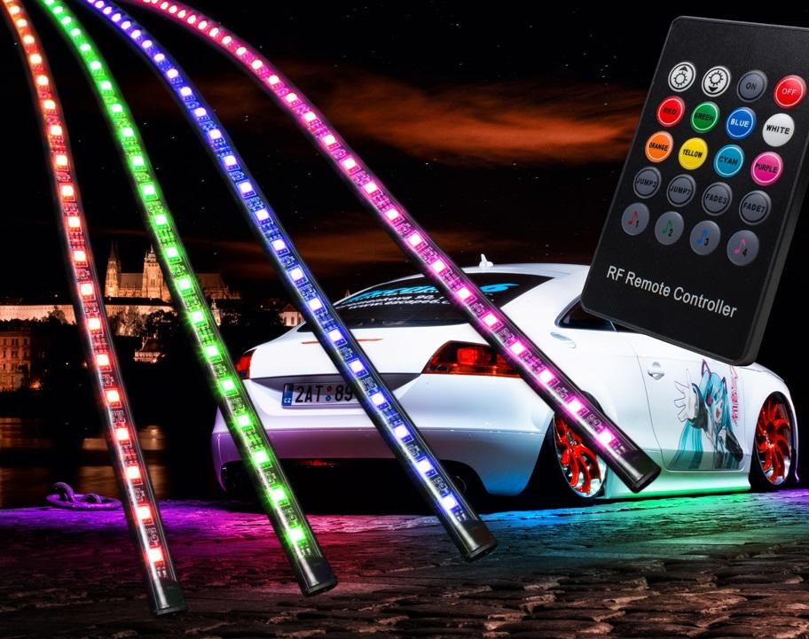 Tyto RGB LED pásky pod auto Music mají vylepšený design, který je vhodný pro všechny modely automobilů. Hlavní předností těchto pásek je vestavěný mikrofon, díky kterému budou barvy skákat do rytmu hudby. V balení naleznete dálkový ovladač na kterém můžete měnit barvy, intenzivitu světla, režimy svícení a hudby. Díky 3M nálepce na zadní straně se dají snadno a rychle připevnit na podvozek automobilu. LED pásky nalepíte na Vámi zvolené místo v autě a pak připojíte k elektrice automobilu. Velice jednoduchá montáž. Připojíte jen 2 kabely (+) a (-) a neony jsou připravené! Pak už jen zapnete bezdrátovým ovladačem. Světelné pásky mají nepromokavý povlak, díky kterému jsou vhodné do každého počasí.