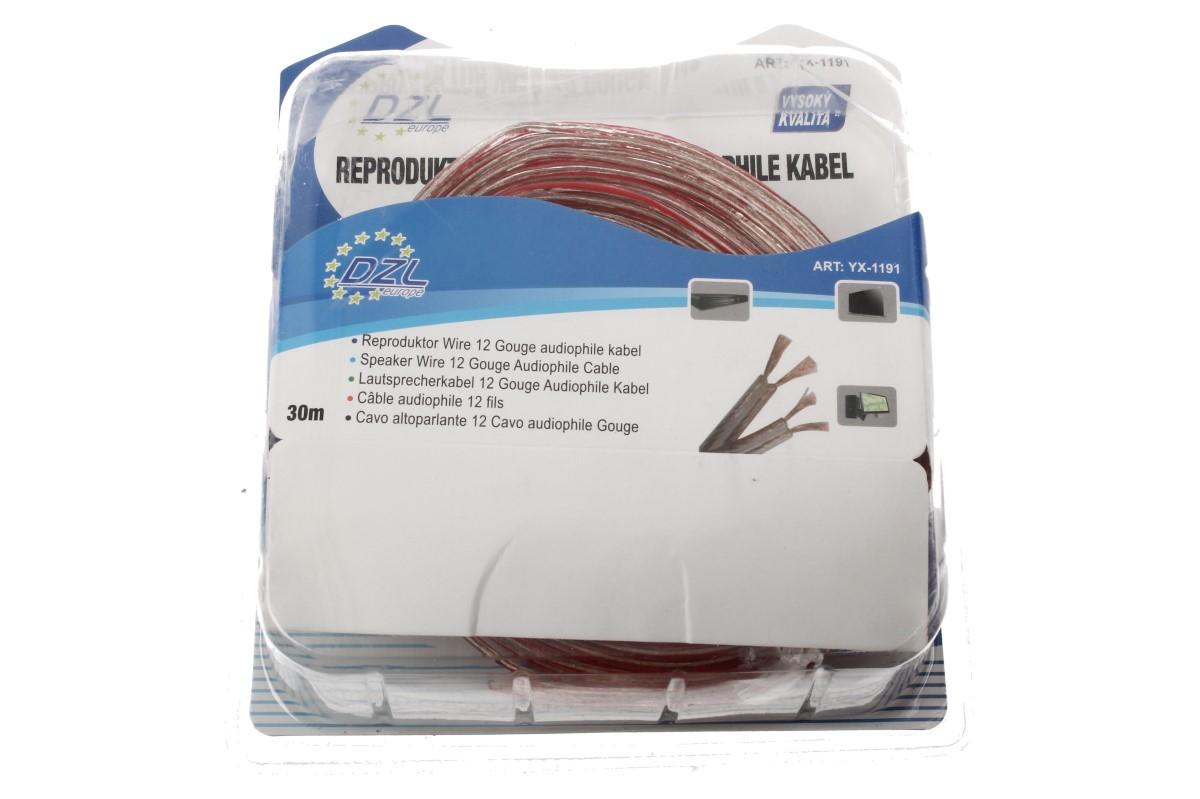 Kabel YX-1191 využijete pro připojení reproduktorů a má délku úctihodných 30 metrů. Jedná se o 100% měděný kabel, obsahující 2 vodiče o průměru 0,75 mm2 s transparentním vzhledem a flexibilní izolací. Tento kabel je schopný přenášet audiosignály od 20 Hz do 20 kHz. Jednotlivé žíly jsou barevně rozlišeny.