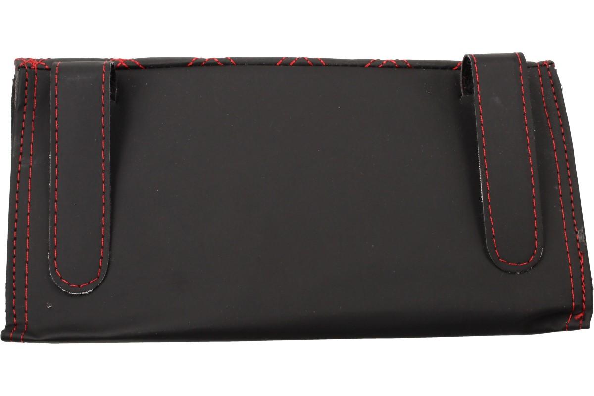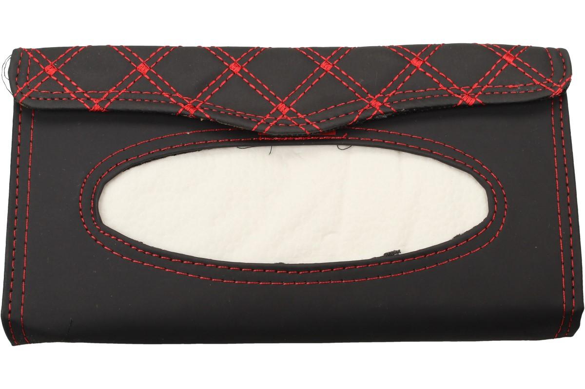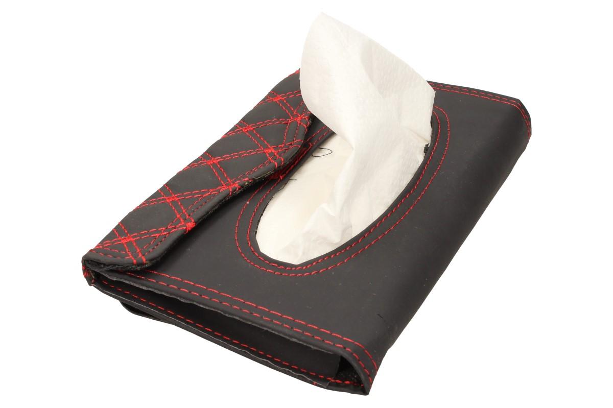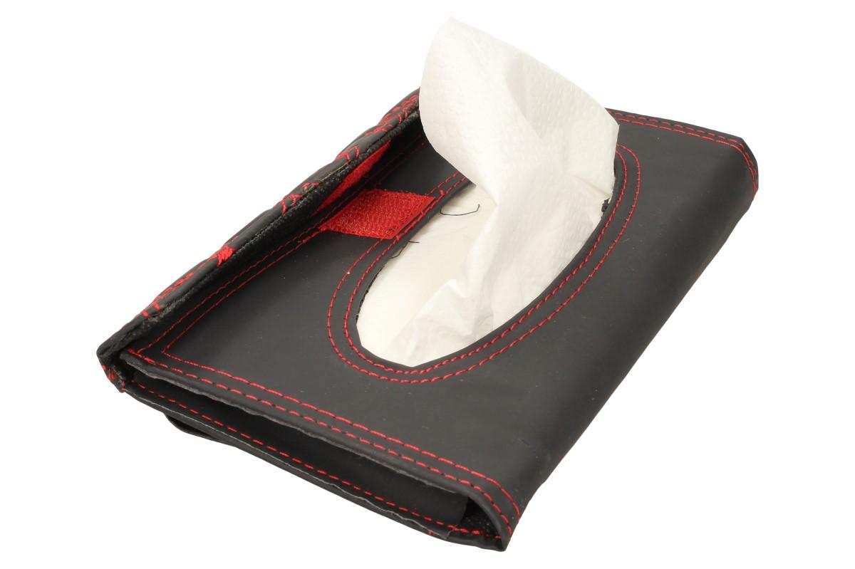 Pouzdro na papírové kapesníky nebo ubrousky můžete umístit kamkoli v autě. Nejčastěji se přidělává na sluneční clony, ale můžete jej uchytit i za síťky, aby na ně měli děti dobrý dosah. Pouzdro je vyrobeno z odolného polyesteru, připomínající kůži a je zdobeno červenou nití do kárového vzoru. Rozměr tohoto pouzdra činí 23 x 12,5 cm a spolu s ním dostanete i několik papírových kapesníků.