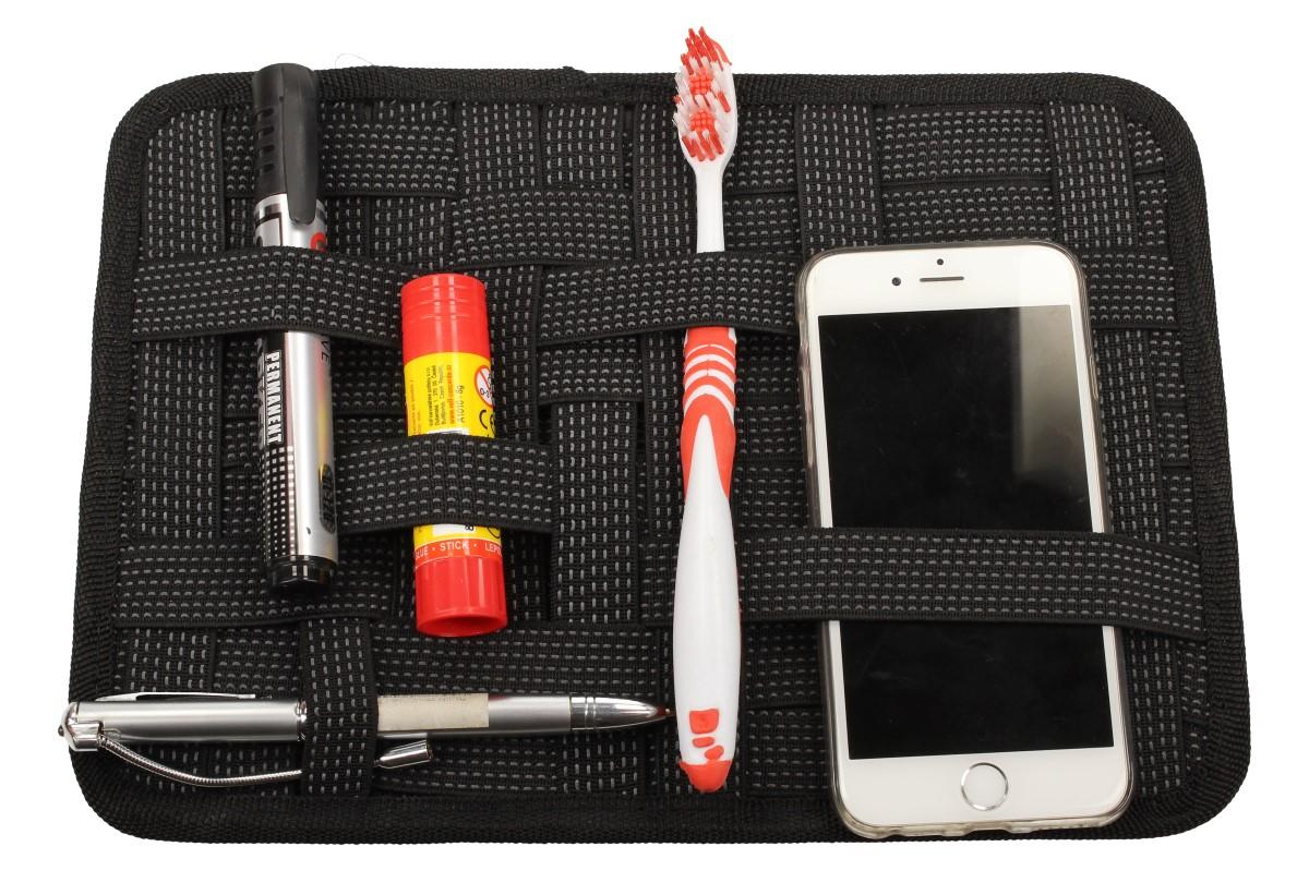 Jedná se o vysoce kvalitní a inovativní produkt, díky kterému budou mít všechny věci své místo, ať už to je elektronika, psací potřeby, hygiena, atd. Organizér je tvořen z elastických pásků, které jsou potaženy protiskluzovou gumou a propleteny různě do sebe. Můžete připevnit pera, poznámkové bloky, mobilní telefony, nabíječky, hygienické potřeby a mnoho dalších položek. Kromě kabelky ho můžete pomocí poutka zavěsit na zeď v dětském pokoji, koupelně, kanceláři či jiném místě. Pokud si dámy zakoupí 2 kusy, jeden mohou mít v kabelce a druhý použít jako organizér na kosmetické potřeby. Na zadní straně také naleznete kapsu na zip, do které si můžete vložit peníze, doklady, karty a jiné důležité věci, co by měly být neustále pod zipem.