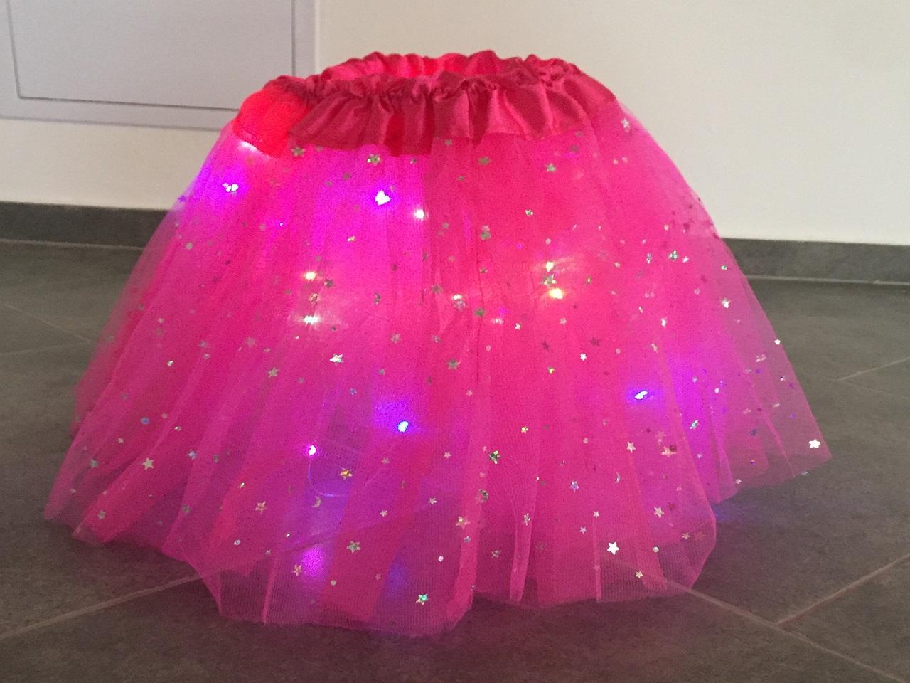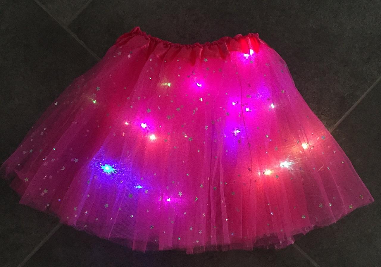 Chce Vaše dítě vždy v něčem vynikat? A co třeba se svítící princeznovskou sukní? S touto parádou se stane hvězdou narozeninové party, oslav, ale také maškarního plesu. Sukně má 3 vrstvy a pod druhou se skrývá drátek s barevnými LED diody, který je k sukni pevně přidělán. V pase naleznete malý ovladač, na kterém můžete přepínat mezi 3mi módy svícení- rychlé blikání, pomalé blikání a svícení. Pokud si ji vaše malá princezna jednou oblékne, už s těží ji bude chtít sundat.