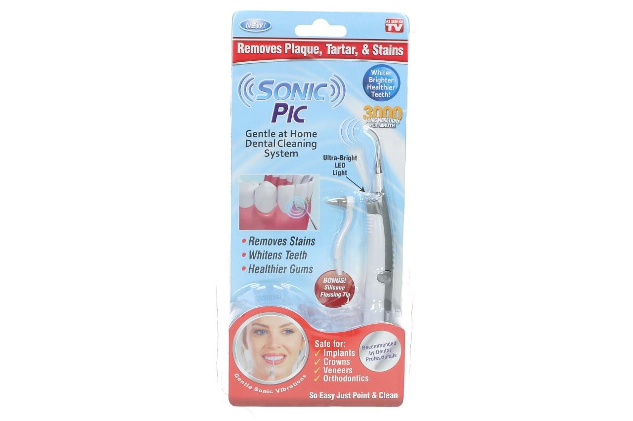 S tímto malým přístrojem Sonic Pic můžete z pohodlí domova odstraňovat zubní plak, zubní kámen a skvrny. Stačí vložit jednu AAA baterii, přiložit strojek na zub s výše uvedeným problémem. Sonic Pic vytváří přes 3000 drobných vibrací za minutu a dostanese tam, kam běžný kartáček ne. Lze jej bezpečně používat na korunky, keramické zuby, rovnátka, fazety, atd. Aby byla Vaše práce ještě efektivnější, strojek je opatřen led světlem, které vám umožní jasně vidět v dutině ústní. V balení obdržíte také silikonový nástavec, se kterým se mohou učit děti.