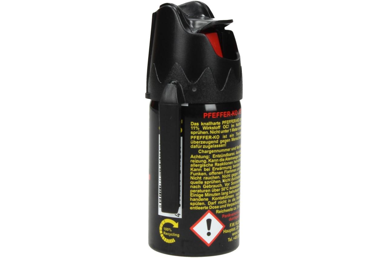 Obranný pepřový sprej KO JET využijete při osobní sebeobraně proti útočníkovi, ať už je to člověk, pes či divoké zvíře. Tento sprej dočasně paralyzuje protivníka a způsobí mu silné podráždění očí a dýchacích cest, v některých případech i dočasnou slepotu. Díky své velikosti jej lze snadno schovat do kapsy nebo díky poutku uchytit za opasek. Vyvarujte se potřísnění očí, pokožky, či sliznice (stříkejte pokud možno po větru).