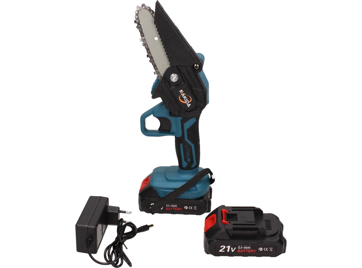 - Obsah balení: pila, 2x výkonná baterie 2 000 mAh, nabíječka, řetěz, klíč, šroubovák