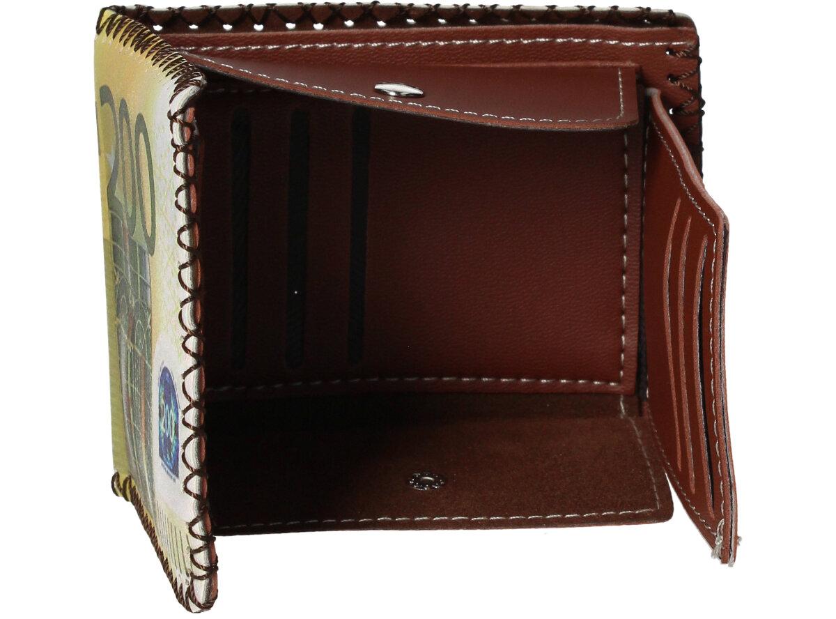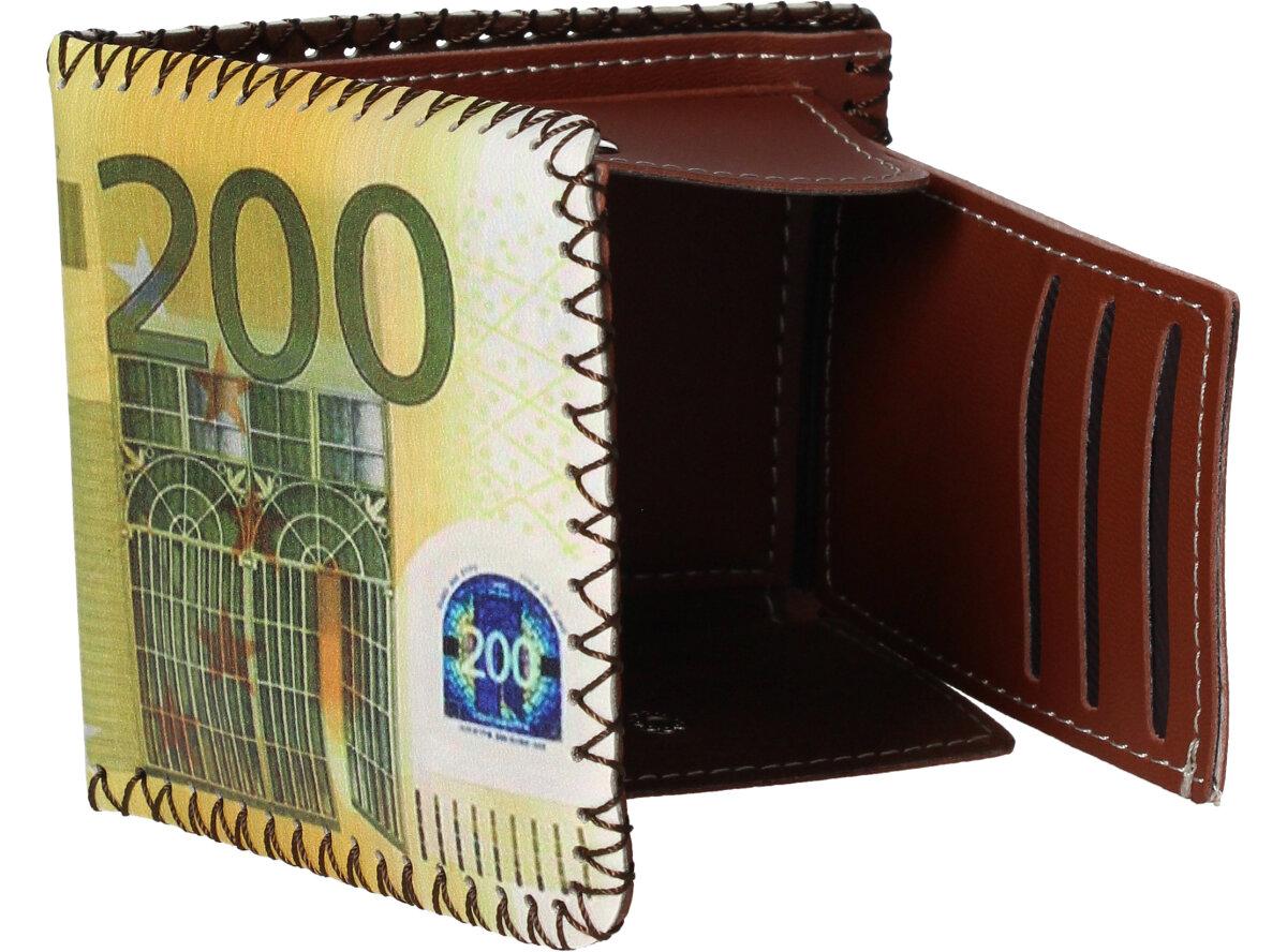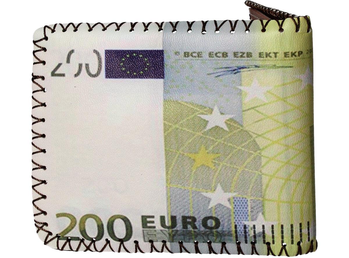Dobrá peněženka za málo peněz s motivem 200 EUR bankovky, nejen na papírová platidla. Disponuje přihrádkami na kreditní karty, občanku, řidičský průkaz a další.