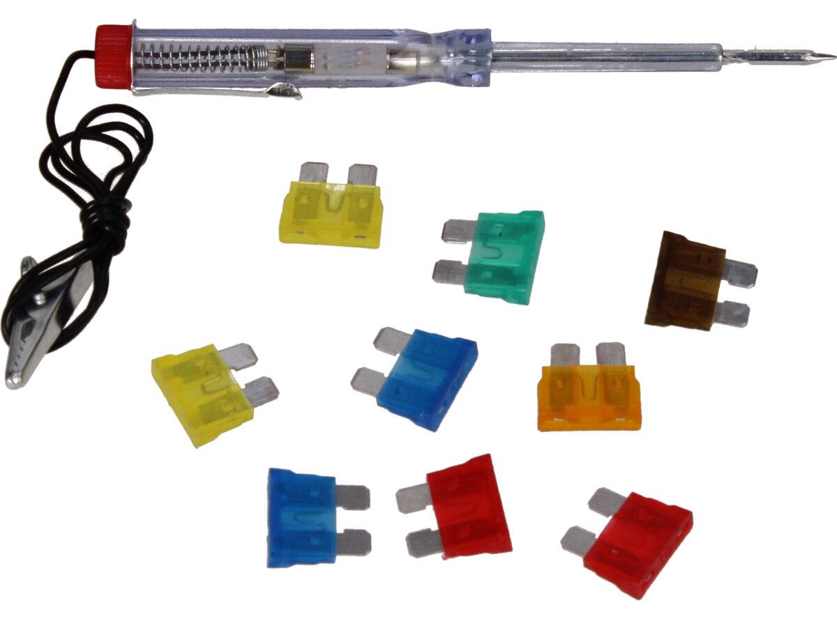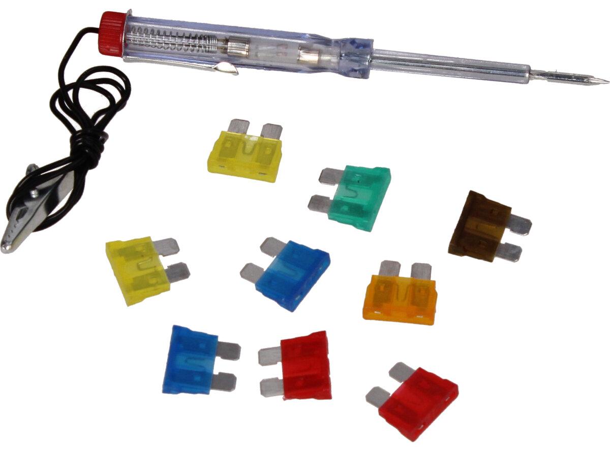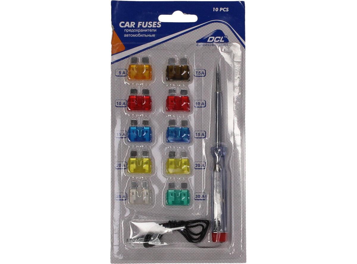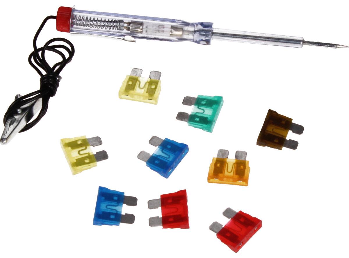 Sada obsahuje zkoušečku na 12V a 10 pojistek rozdílných proudových hodnot (- 2x červená: 10A, 1xoranžová 5A, 1x hnědá 7,5A, 2x modrá 15A, 2x žlutá 20A, 1x bílá 25A, 1x zelená 30A). Rozměr pojistky je 1,9 x 1,9 x 0,5 cm.