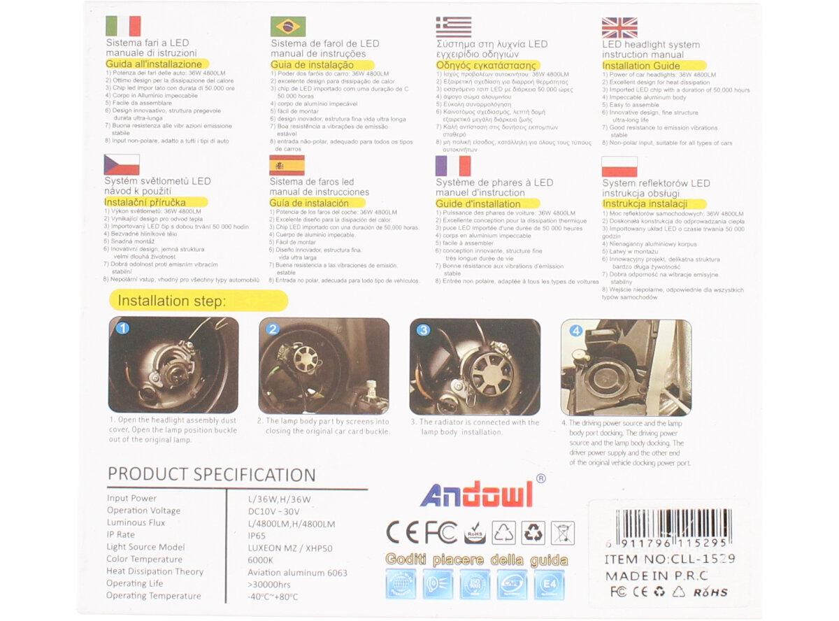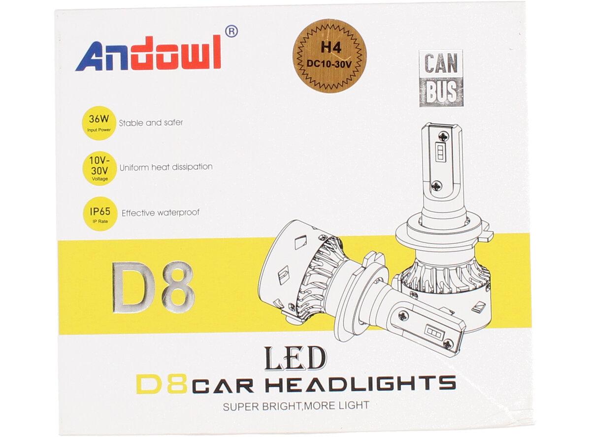 Sada dvou LED žárovek ANDOWL D8 H4 CANBUS 10-30V 36W Vám poskytnou jasné bílé světlo a velmi dlouhou životnost 50 000 hodin a to i při otřesech vozu, častém zapínání a vypínání, což je velká výhoda oproti klasickým žárovkám. Žárovky jsou vyrobeny tak, aby jejich instalace nebyla náročná.