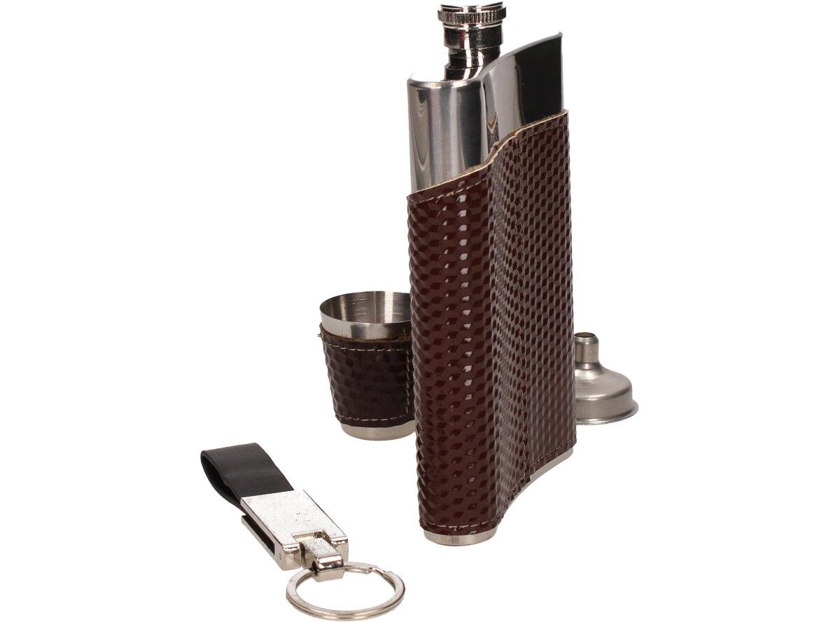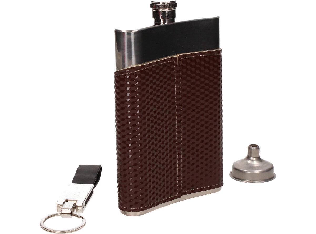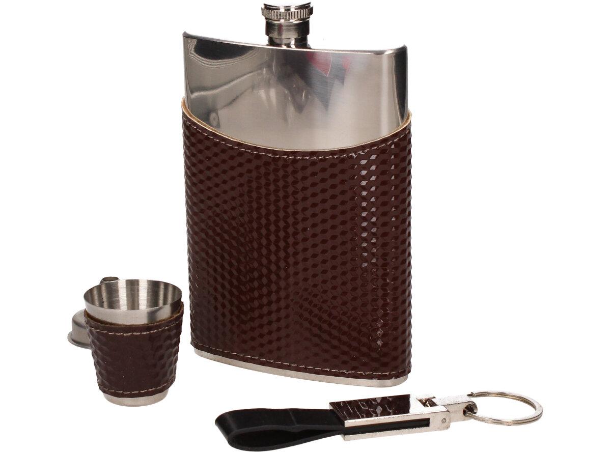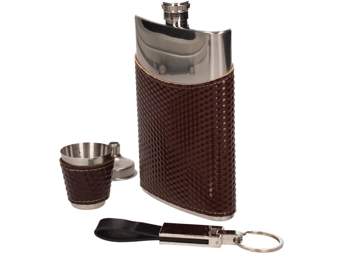 Dárková sada placatka, 4 kusy z nerezové kvalitní oceli v kožence. Dárková sada obsahuje 1x placatku, 1x panák, 1x nálevku a 1x klíčenku vše v dekoru koženky v dárkové sadě krabičce.