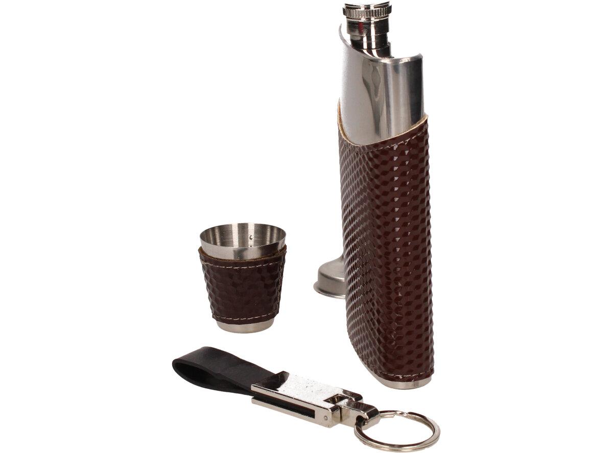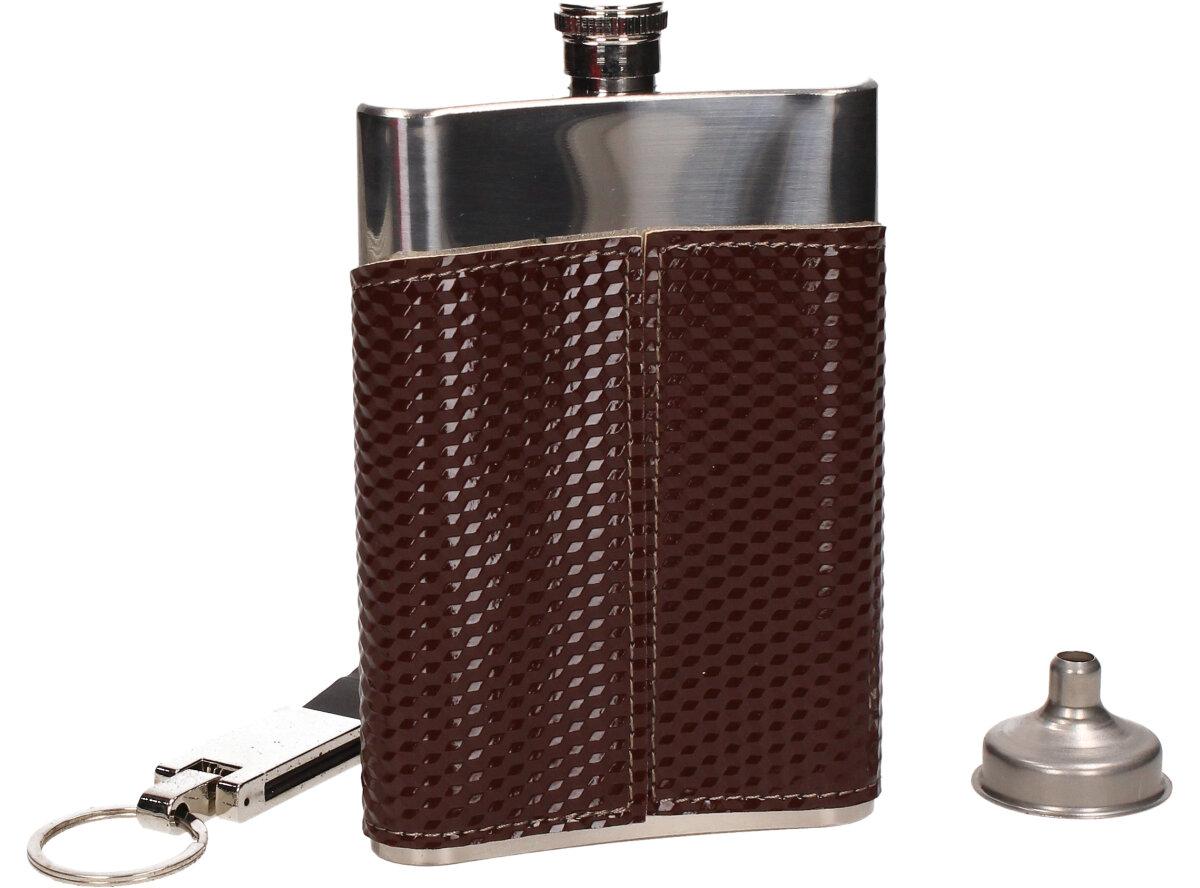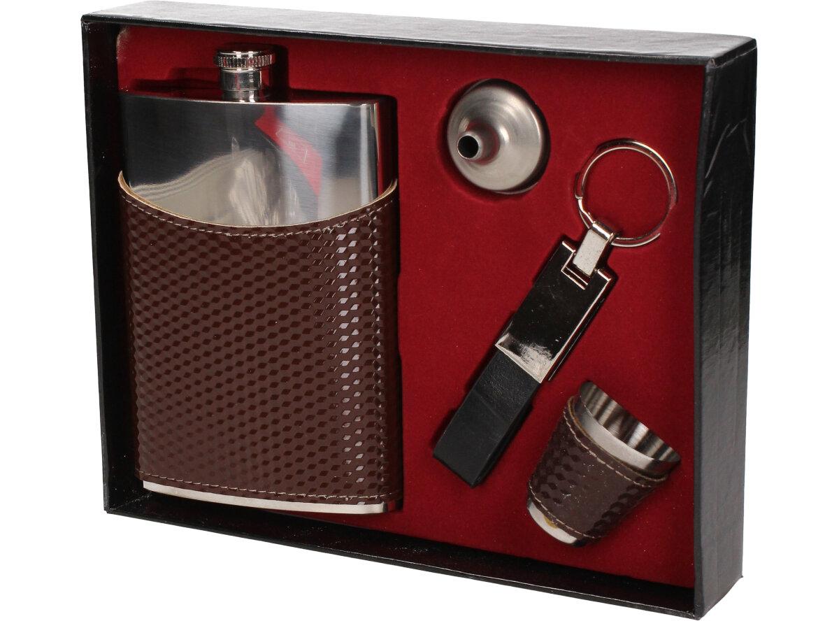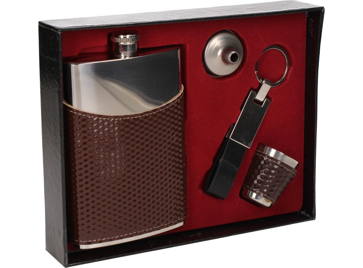 Dárková sada placatka, 4 kusy z nerezové kvalitní oceli v kožence. Dárková sada obsahuje 1x placatku, 1x panák, 1x nálevku a 1x klíčenku vše v dekoru koženky v dárkové sadě krabičce.